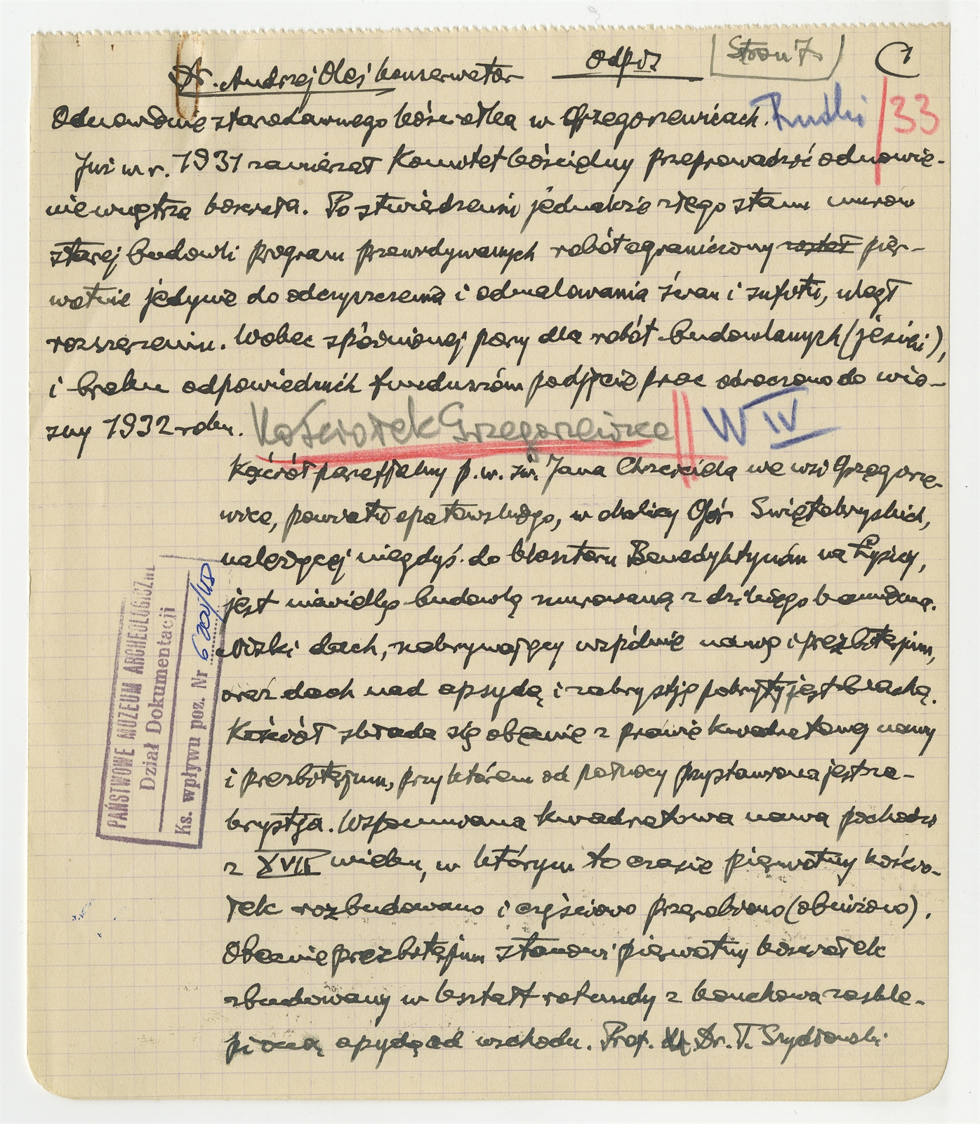 Rękopis odpisu sporządzony przez S. Krukowskiego z maszynopisu na temat historii i remontu kościółka w Grzegorzewicach - strona 1: zatytułowana "Dr. Andrzej Oleś konserwator" - "Odnowienie starodawnego kościoła w Grzegorzewicach" "Już w 1931" … "Prof.. Dr. T. Szydłowski" (autorska strona 1)
