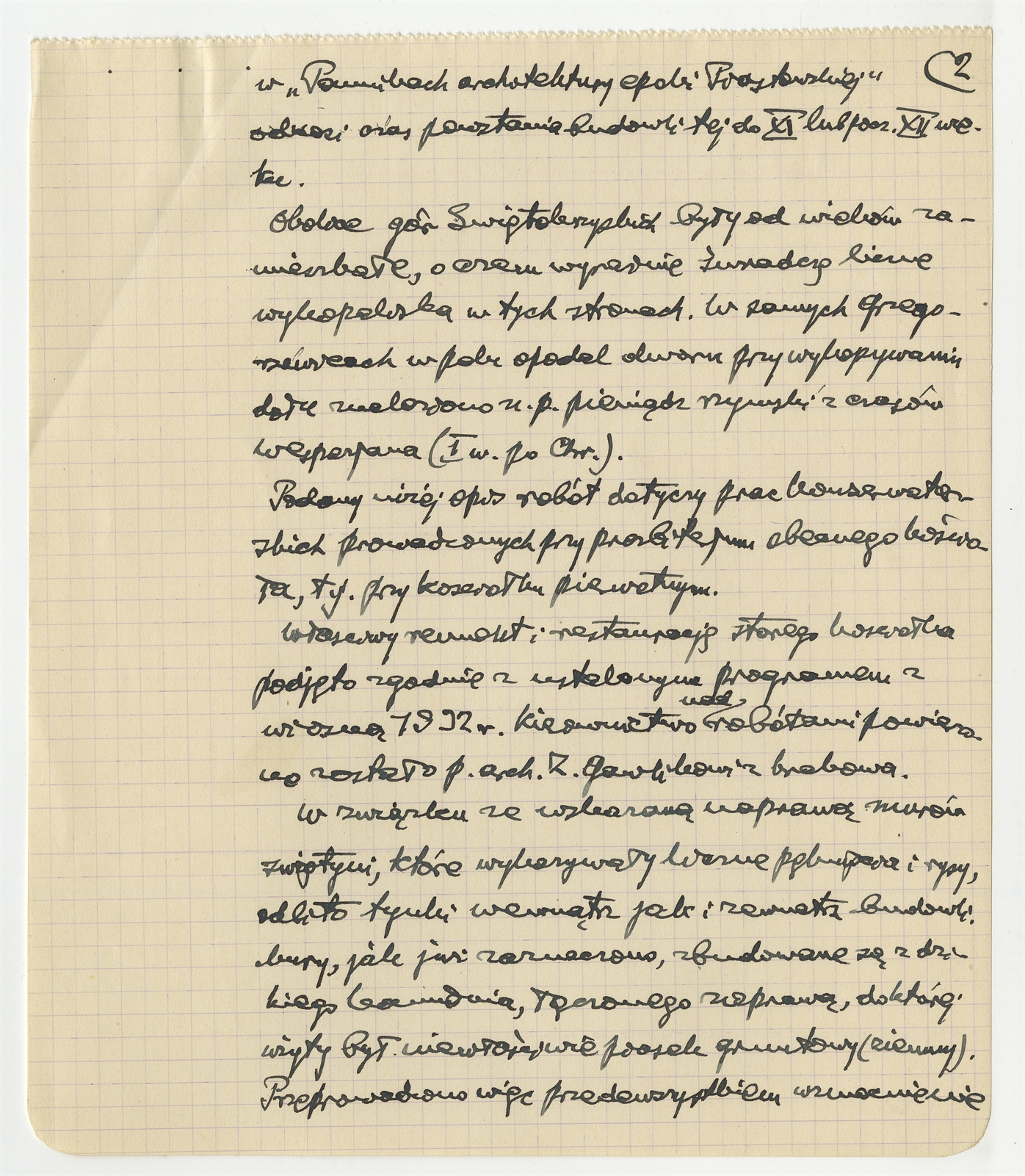 Rękopis odpisu sporządzony przez S. Krukowskiego z maszynopisu na temat historii i remontu kościółka w Grzegorzewicach - strona 2: "w "Pamiętnikach architektury" … "przedewszystkiem wzmocnienie" (autorska strona 2)