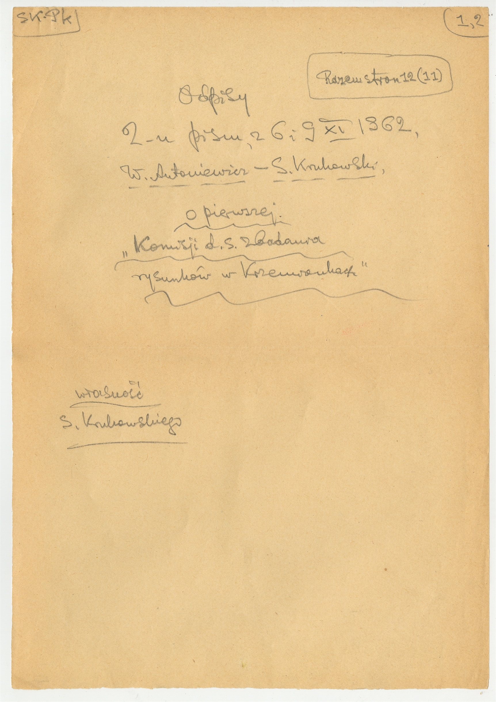 Rękopis - odpisy dwóch pism: PAN do S. Krukowskiego z dnia 6 XI 1962 roku oraz S. Krukowskiego do W. Antoniewicza z dnia 9 XI 1962 roku - strona tytułowa.