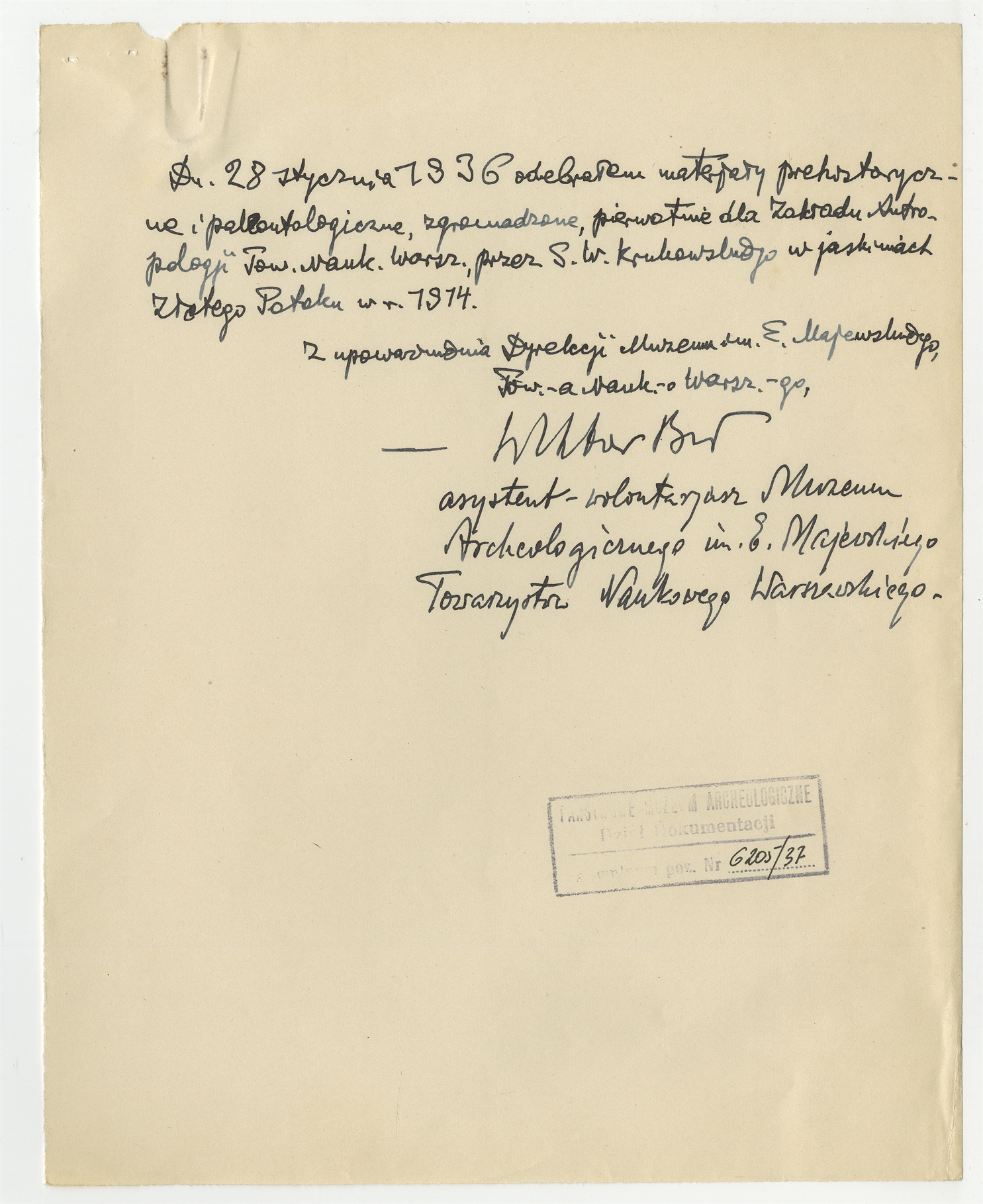 Rękopis oświadczenia mgr. Wiktora Bera asystenta Muzeum Archeologicznego im. Er. Majewskiego T.N.W. o odebraniu od Stefana Krukowskiego materiału archeologicznego pozyskanego w jaskiniach Złotego Potoku w 1914 r. 28 stycznia 1937
