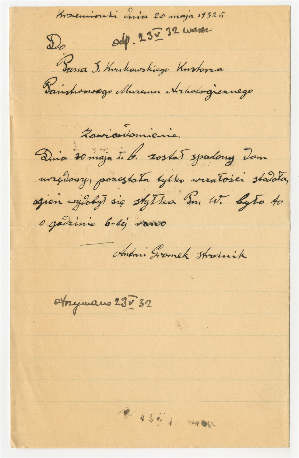 Rękopis pisma Antoniego Gromka "Do Pana S. Krukowskiego Kustosza Państwowego Muzeum Archeologicznego" z dnia 20 maja 1932 r.