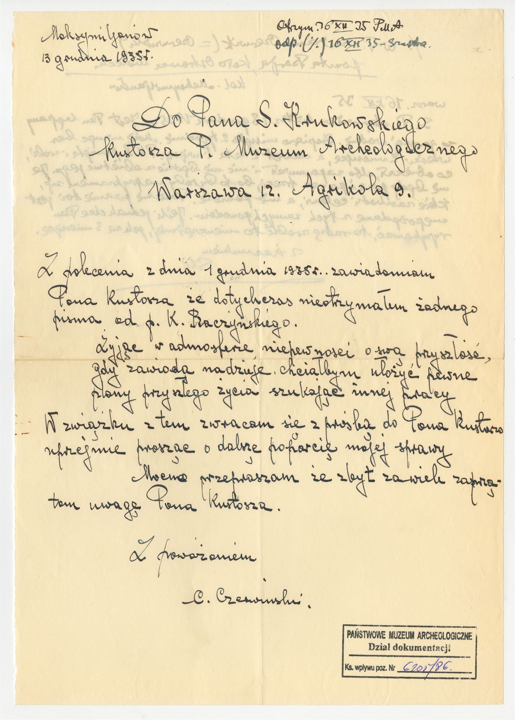Rękopis pisma C. Czerwińskiego "Do Pana S. Krukowskiego Kustosza P. Muzeum Archeologicznego …" z dnia 13 grudnia 1935 r.