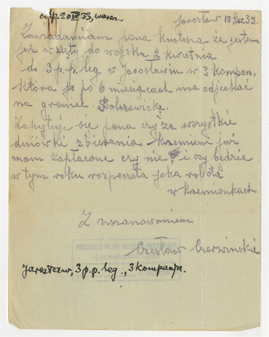 Rękopis pisma Czesława Czerwińskiego do prof. Stefana Krukowskiego z dnia 10 kwietnia [19]33 r. - "Zawiadamiam pana kustosza że jestem już wzięty do wojska 2 kwietnia …"