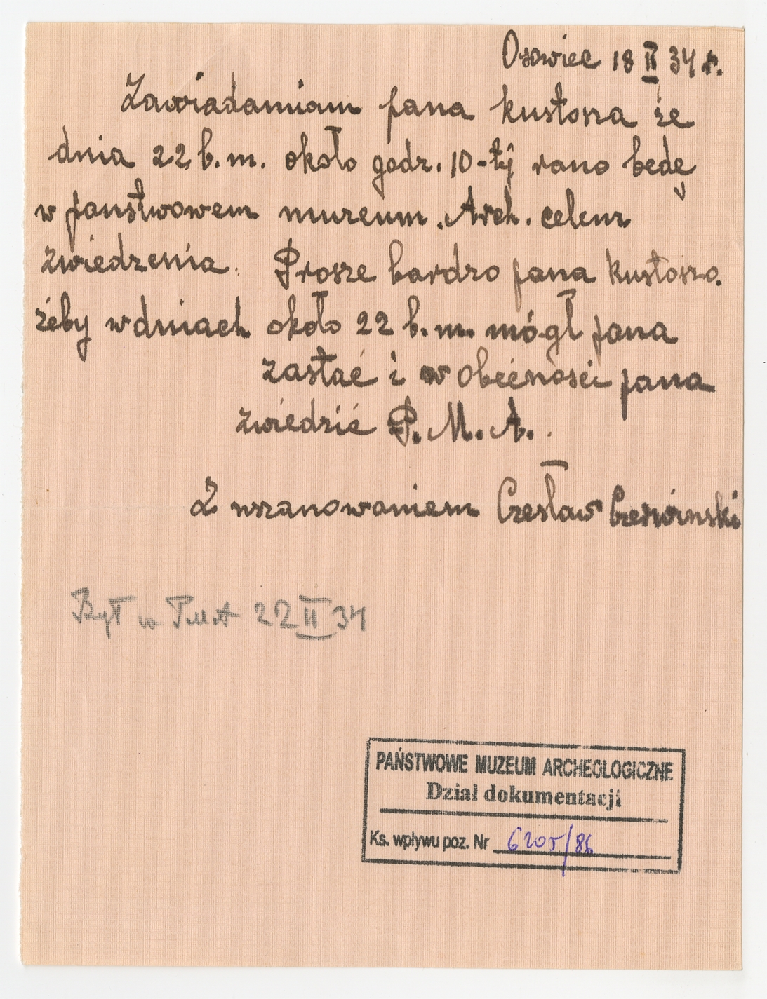 Rękopis pisma Czesława Czerwińskiego do prof. Stefana Krukowskiego z dnia 18 II [19]34 r.: "Zawiadamiam pana kustosza …"