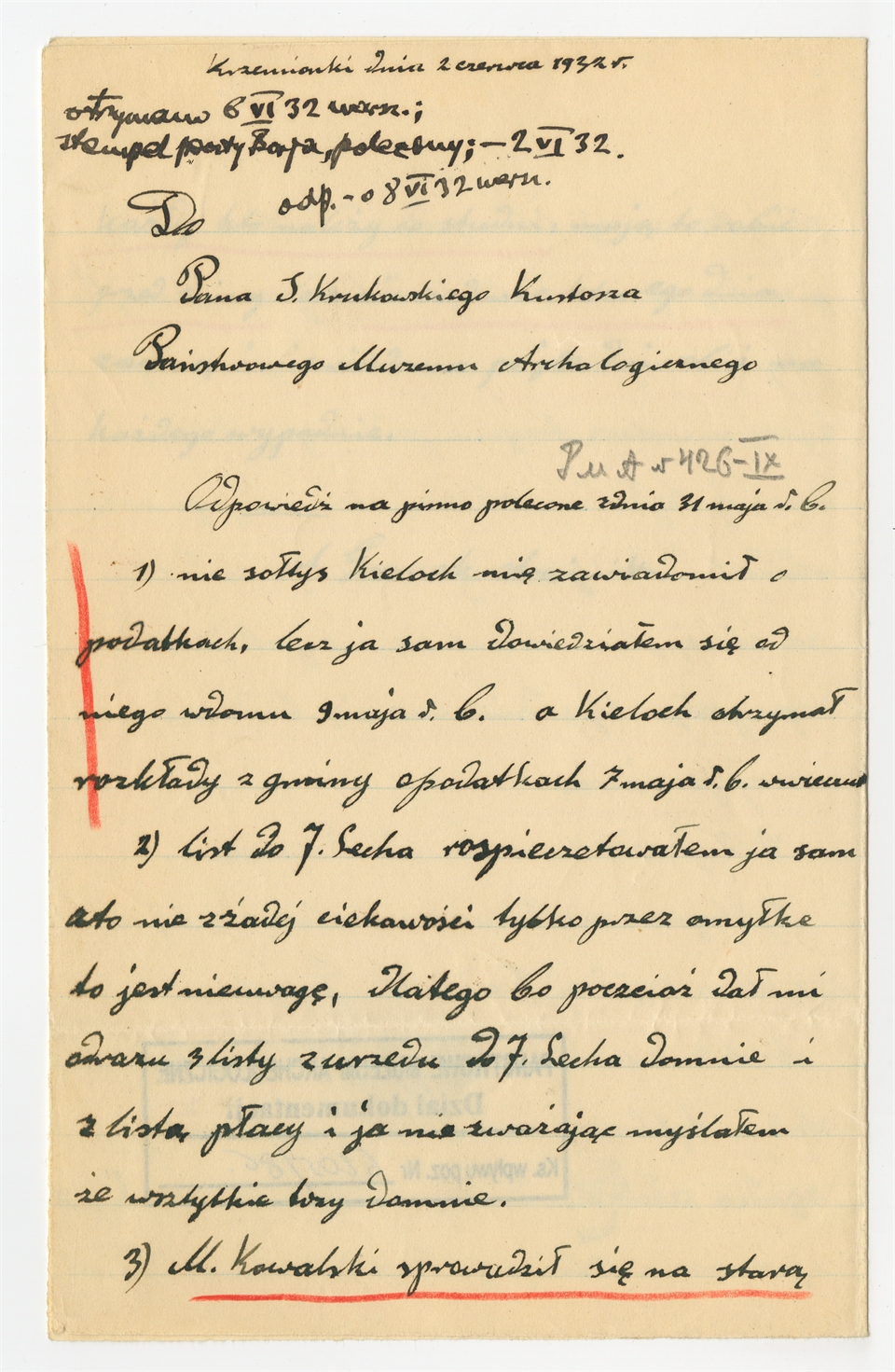 Rękopis pisma A. Gromka "Do Pana S. Krukowskiego Kustosza Państwowego Muzeum Archeologicznego" z dnia 2 czerwca 1932 r.