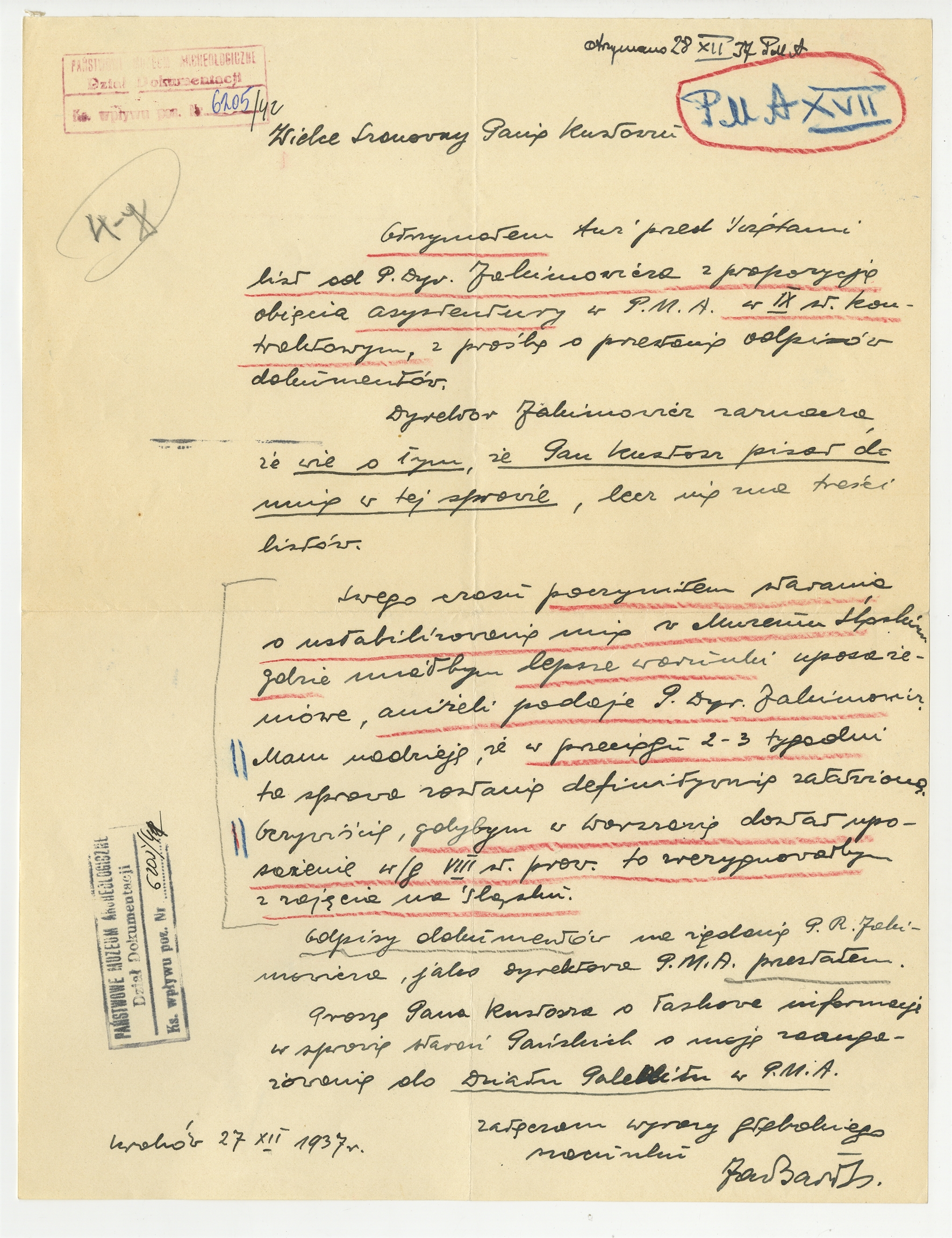 Rękopis pisma Jana Bartysa z 27 XII 1937 r. skierowanego do kustosza [Stefana Krukowskiego] : "[…] Otrzymałem tuż przed świętami list od p. Dyr. Jakimowicza […]"