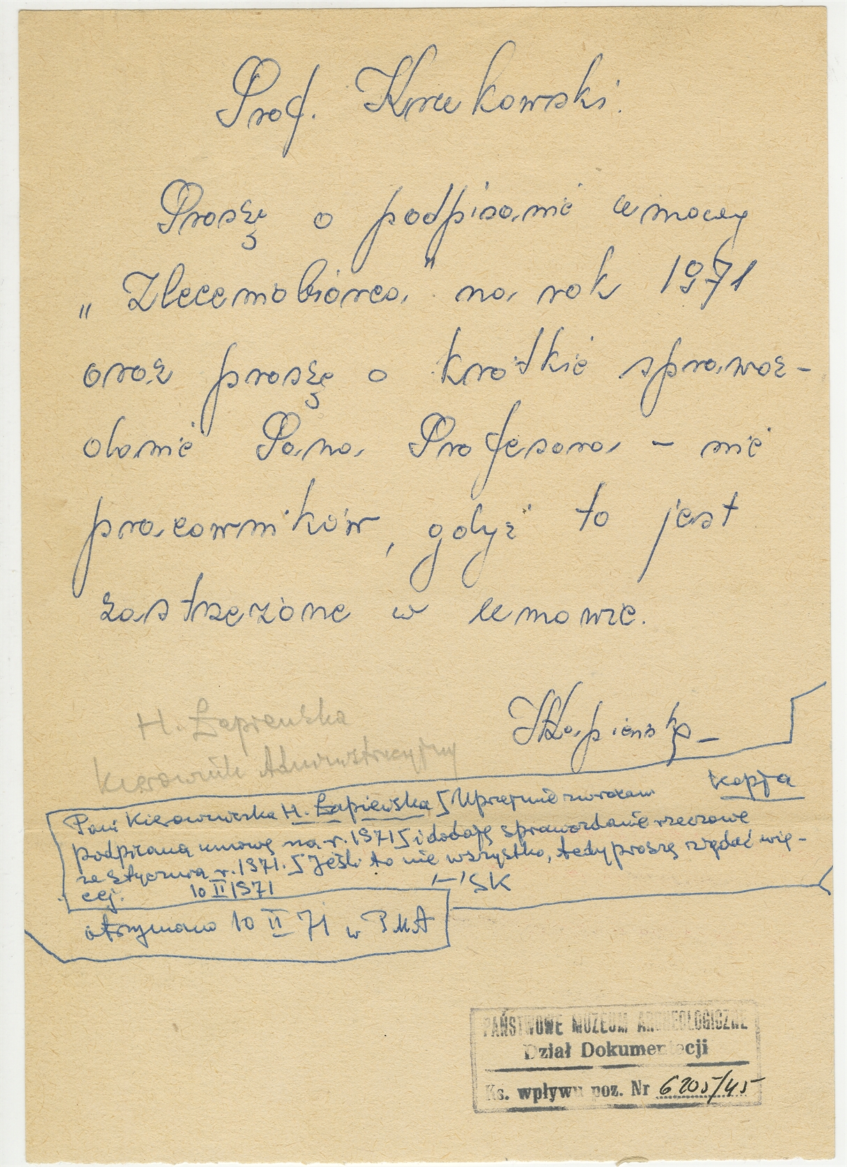 Rękopis pisma Kierownika Administracyjnego H. Łapieńskiej do S. Krukowskiego w sprawie podpisania umowy na rok 1971 napisania sprawozdania rzeczowego ze stycznia roku 1971 oraz krótka odnosząca się do sprawy notatka sporządzona przez S. Krukowskiego - strona 1: zatytułowana "Prof. Krukowski" "Proszę o podpisanie umowy" ... "otrzymano 10 II 71 w PMA" 10 II [19]71 (bez numeru strony)