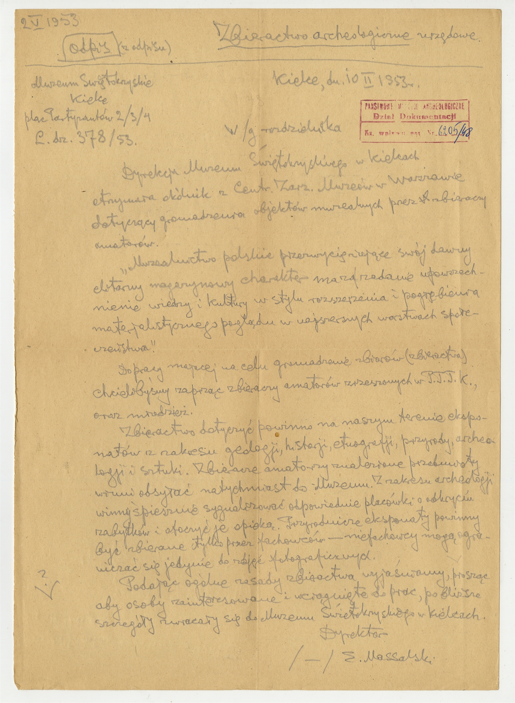 Rękopis pisma Muzeum Świętokrzyskiego w Kielcach zatytułowany "Zbieractwo archeologiczne urzędowe" - strona 1: "Dyrekcja Muzeum Świętokrzyskiego" … "do Muzeum Świętokrzyskiego w Kielcach" 2 V 1953
