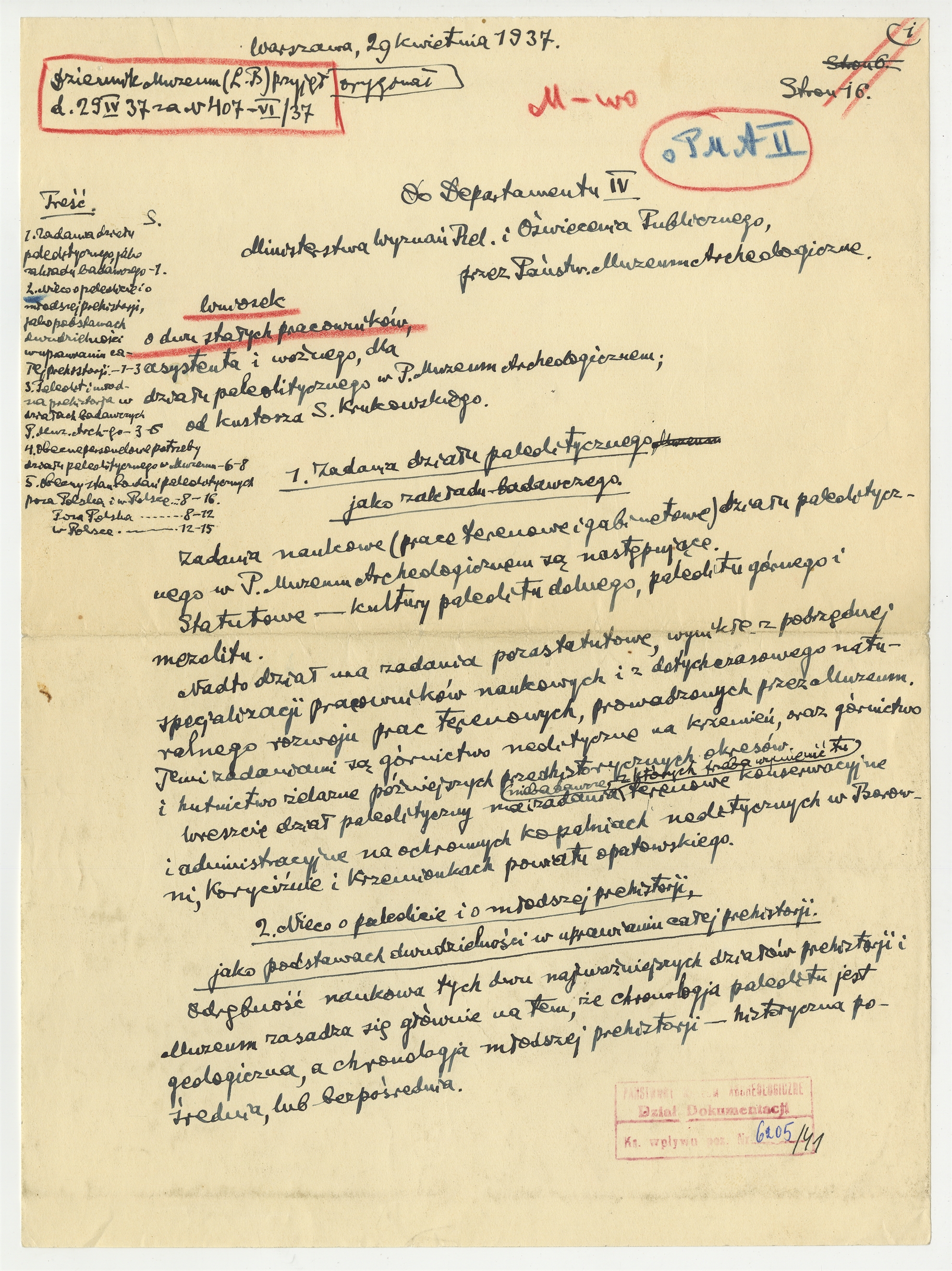 Rękopis pisma prof. Stefana Krukowskiego z dnia 29 kwietnia 1937 skierowanego do "Departamentu IV Ministerstwa Wyznań Rel. i Oświecenia Publicznego" - "Wniosek o dwu stałych pracowników asystenta i woźnego dla działu paleolitycznego w P. Muzeum Archeologicznem"