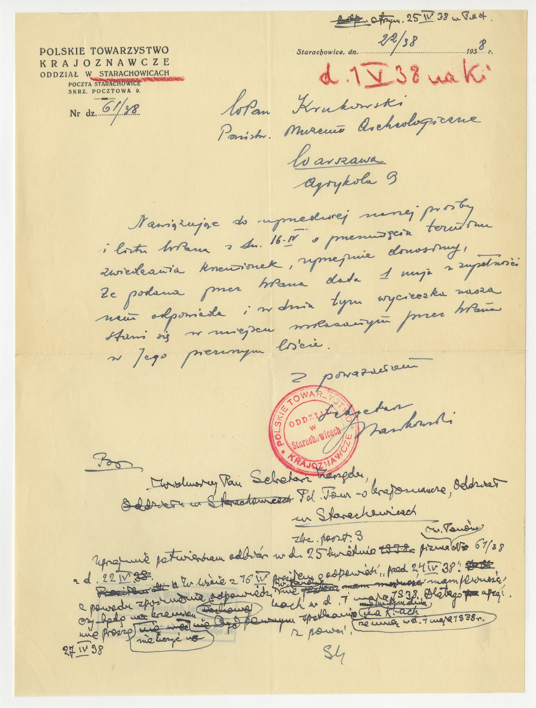 oraz rękopis - brudnopis pisma Stefana Krukowskiego do Polskiego Towarzystwa Krajoznawczego Oddział w Starachowicach z potwierdzeniem odbioru w/w pisma 27 IV [19]38 - strona 1