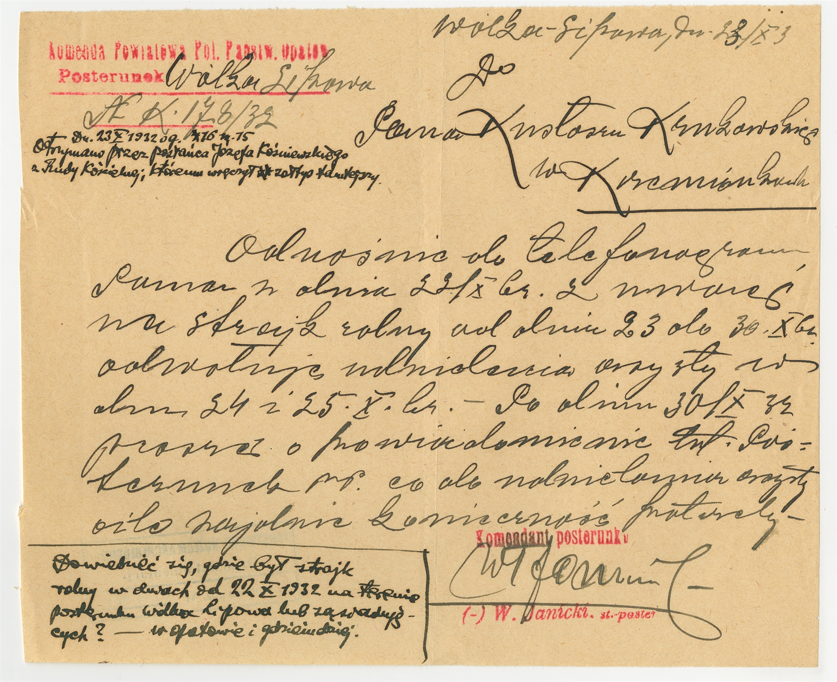 Rękopis pisma z Komendy Powiatowej Pol. Państw. Opatów do Pana Kustosza Krukowskiego w Krzemionkach z dnia 23 X [1932] r.