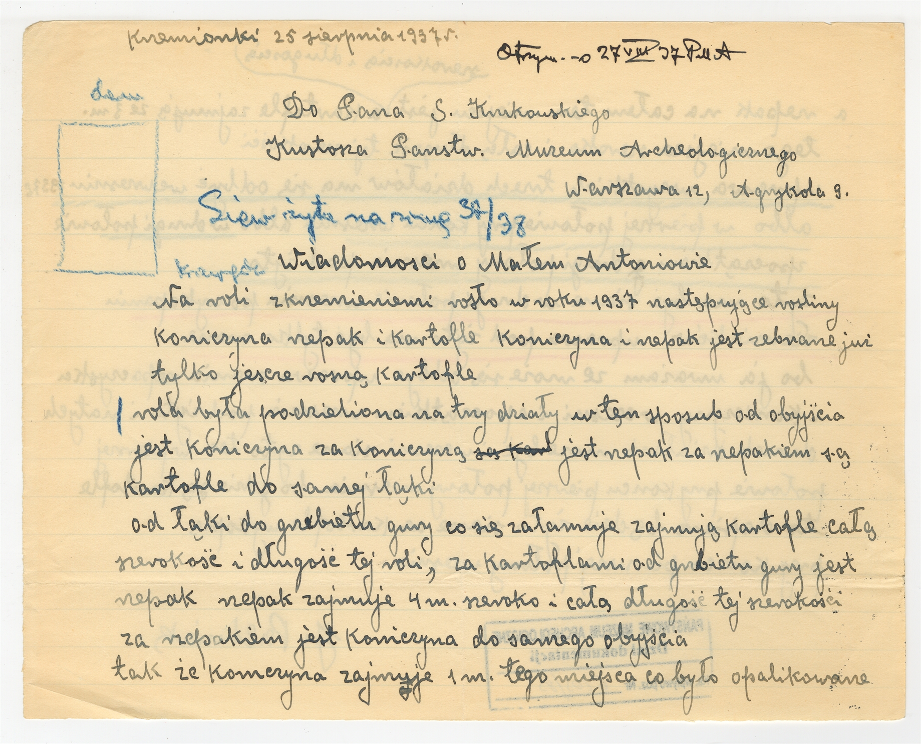 Rękopis - pismo J. Pachniaka do prof. Stefana Krukowskiego Krzemionki 25 VIII 1937 r. - "Wiadomości o Małem Antoniowie…"