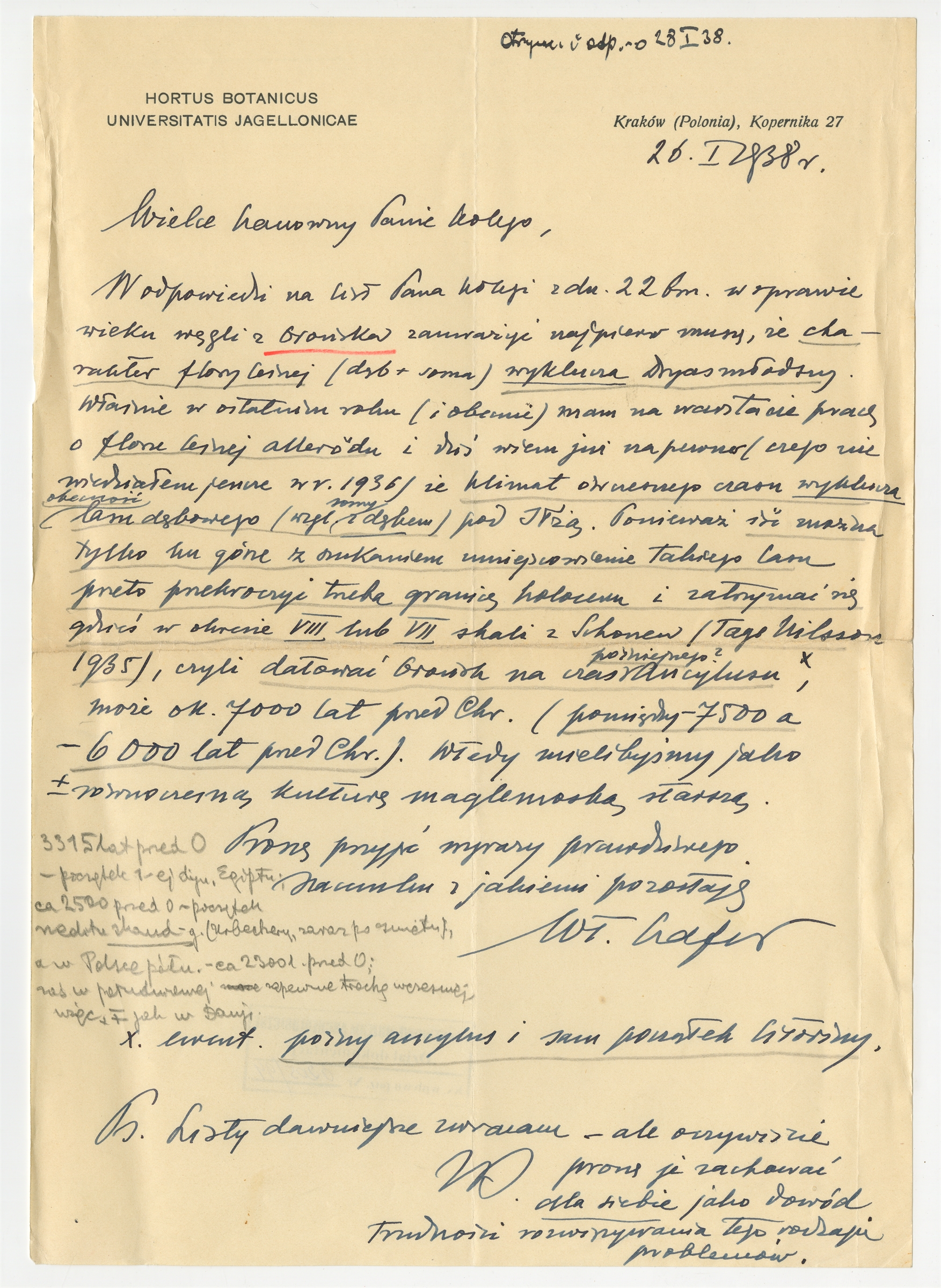 Rękopis - pismo prof. W. Szafera do prof. Stefana Krukowskiego Kraków 26 I 1938 r. z notatką ołówkiem prof. Krukowskiego