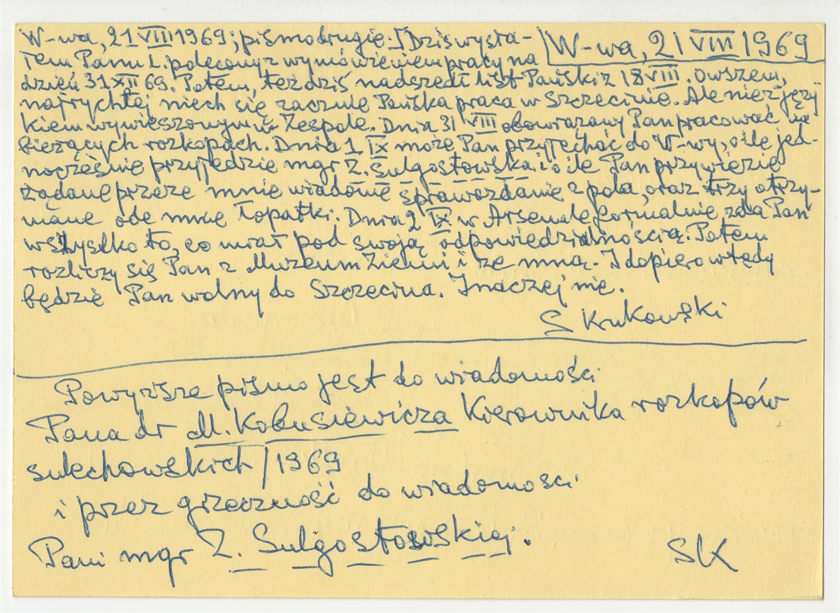 Rękopis - pismo S. Krukowskiego do M. Czarneckiego sporządzone na karcie pocztowej dotyczące wymówienia pracy na dzień 31 XII 69 oraz związanych z tym spraw formalnych - strona 2: zatytułowana "W-wa 21 VIII 1969; pismo drugie" "Dziś wysłałem Panu" …"Pani mgr Z. Sulgostowskiej - SK" W-wa 21 VIII 1969