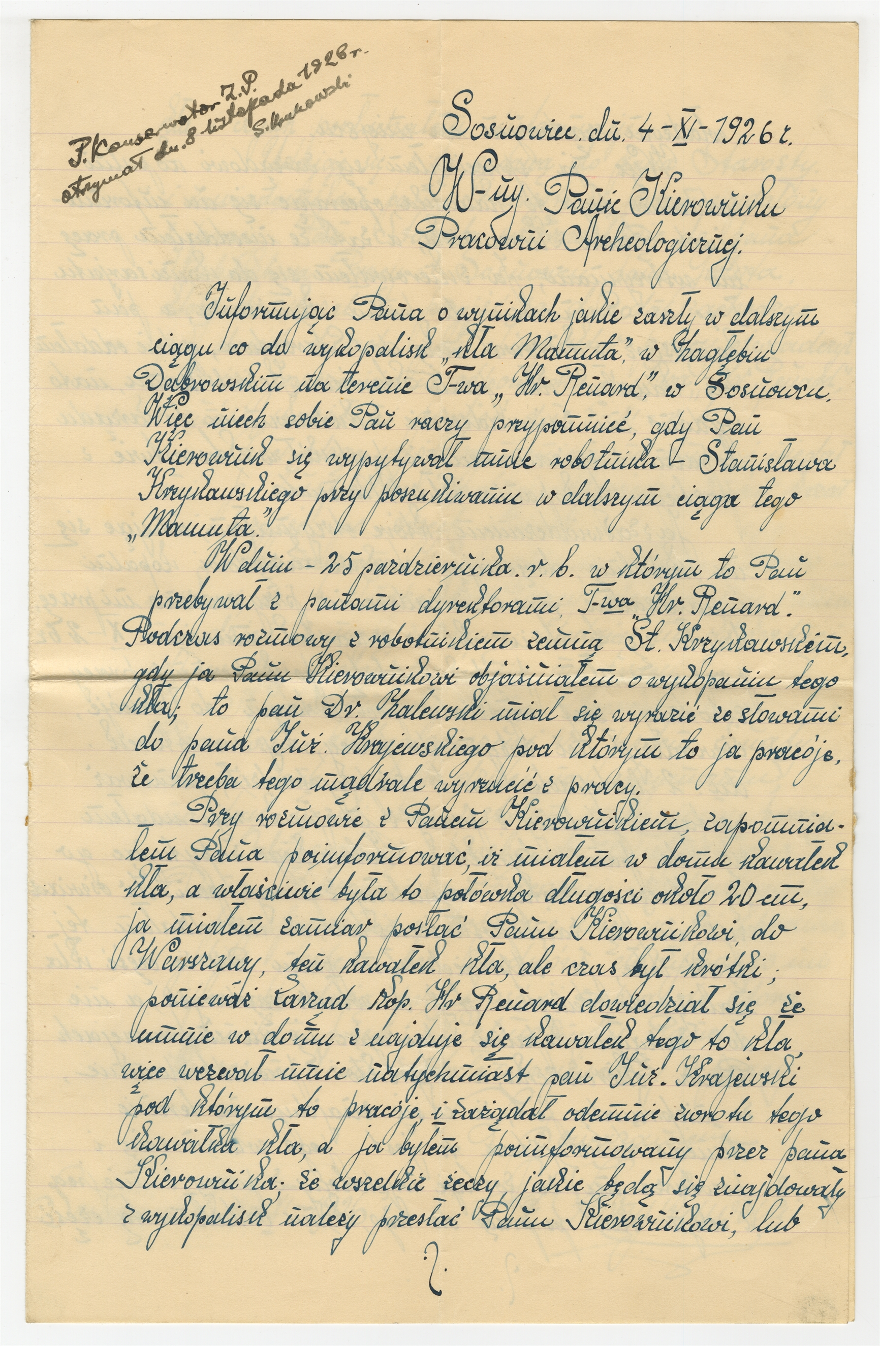 Rękopis - pismo S. Krzykowskiego do Pana Kierownika Pracowni Archeologicznej Sosnowiec 4 XI 1926 r. z adnotacją prof. Krukowskiego o wpłynięciu pisma - "Informując Pana o wynikach…"