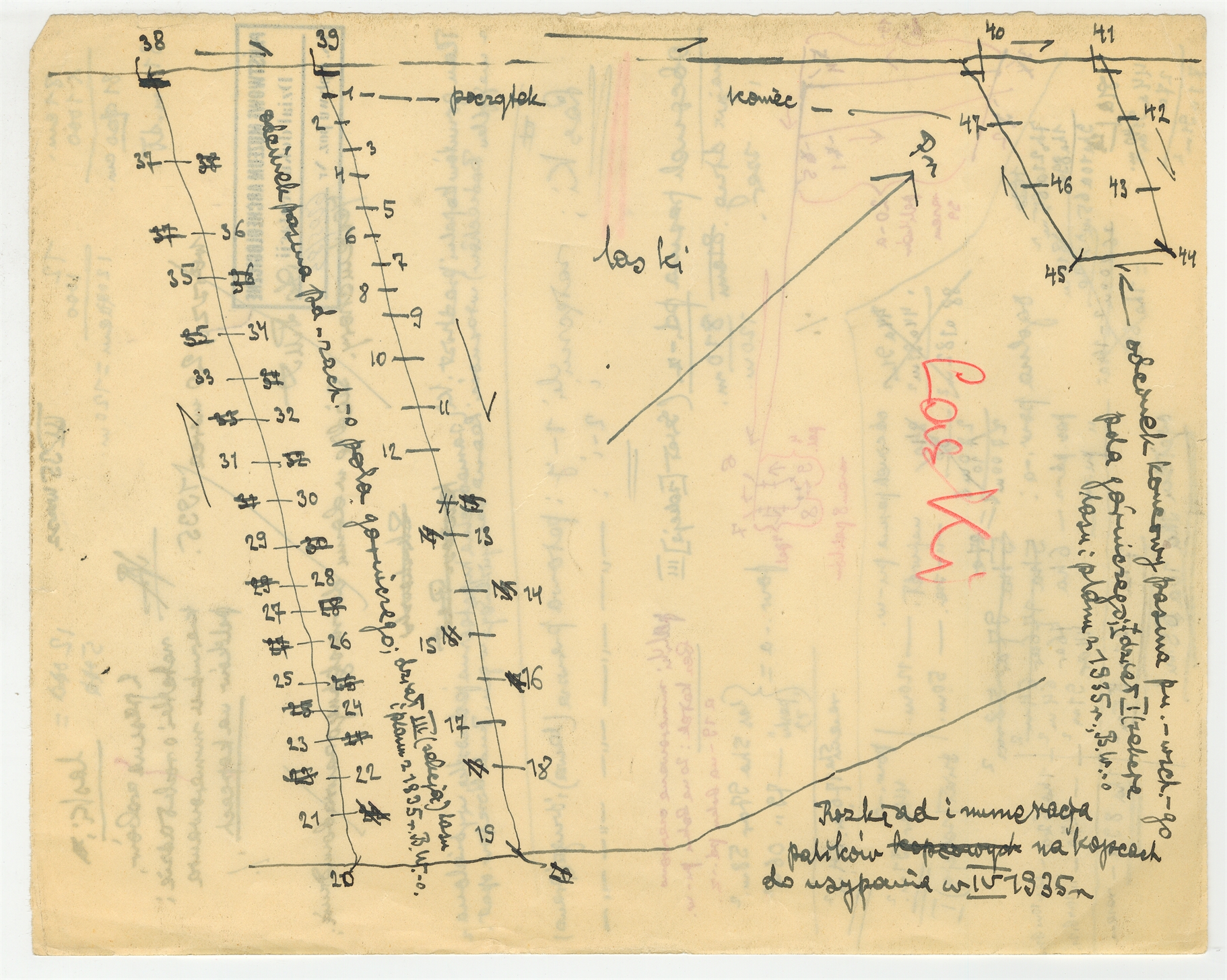 Rękopis - plan Stefana Krukowskiego "Rozkład i numeracja palików na kopcach do usypania w IV 1935 roku"