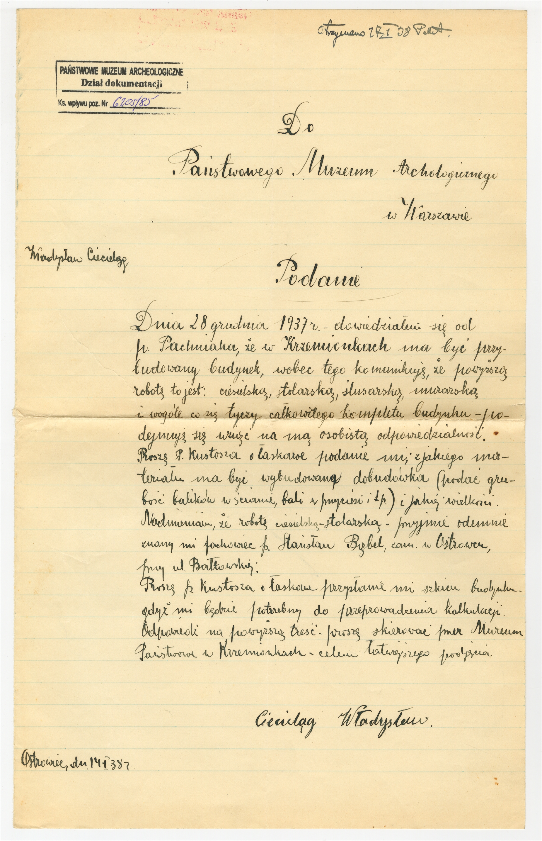 Rękopis - Podanie do Państwowego Muzeum Archeologicznego w Warszawie od pana Władysława Ciecieląga Ostrowiec 14 I 1938 r.