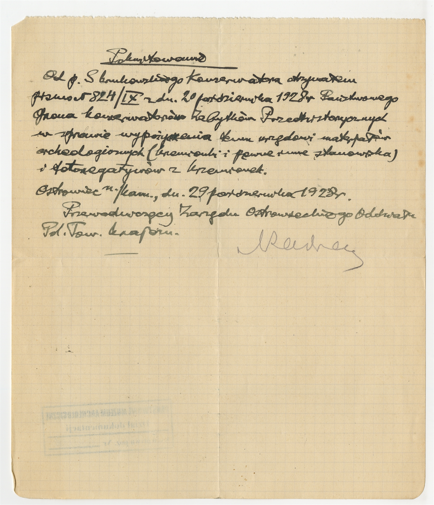Rękopis pokwitowania Przewodniczącego Zarządu Ostrowieckiego Oddziału Polskiego Towarzystwa Krajoznawczego otrzymania pisma Państwowego Grona Konserwatorów Zabytków Przedhistorycznych nr 824/IX z dnia 20 października 1298 r. Ostrowiec n/Kamienną 29 października 1928 r. - strona 1
