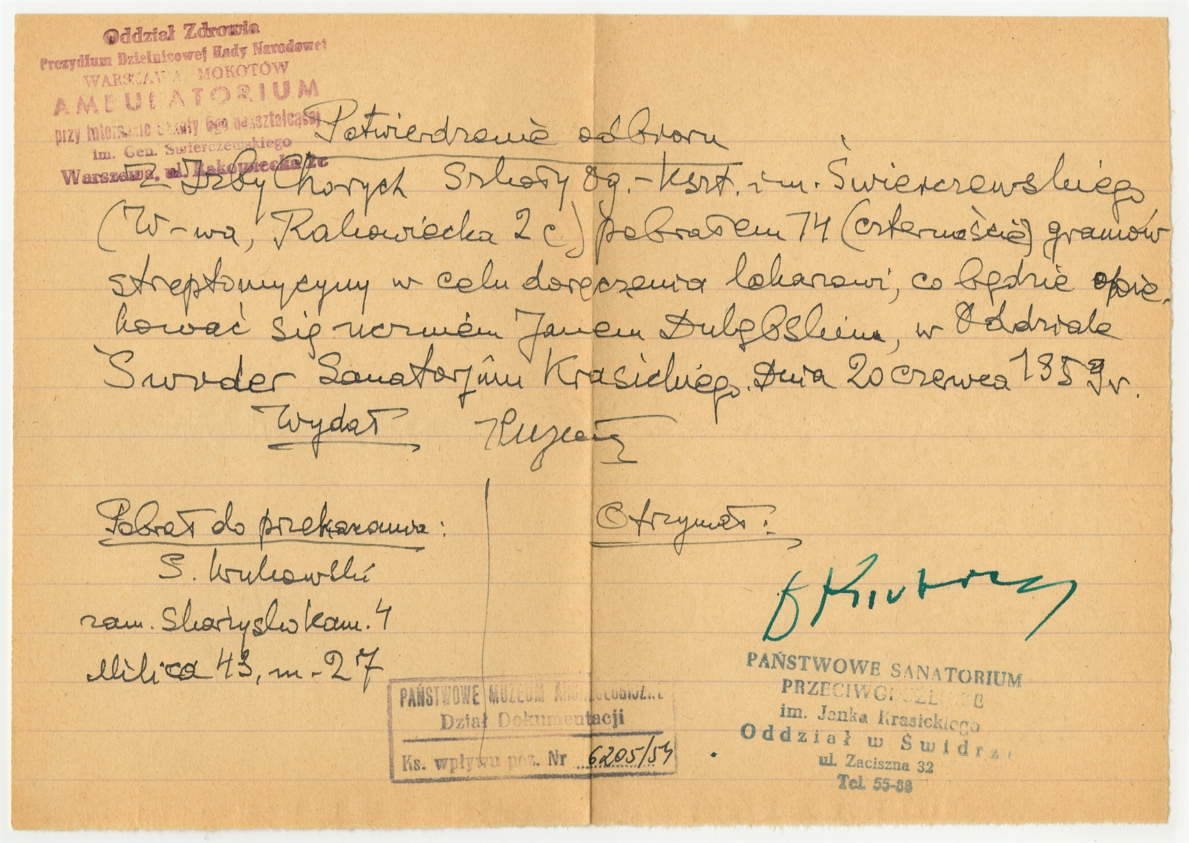 Rękopis - potwierdzenie odbioru leku przez Stefana Krukowskiego z dnia 20 czerwca 1959 roku
