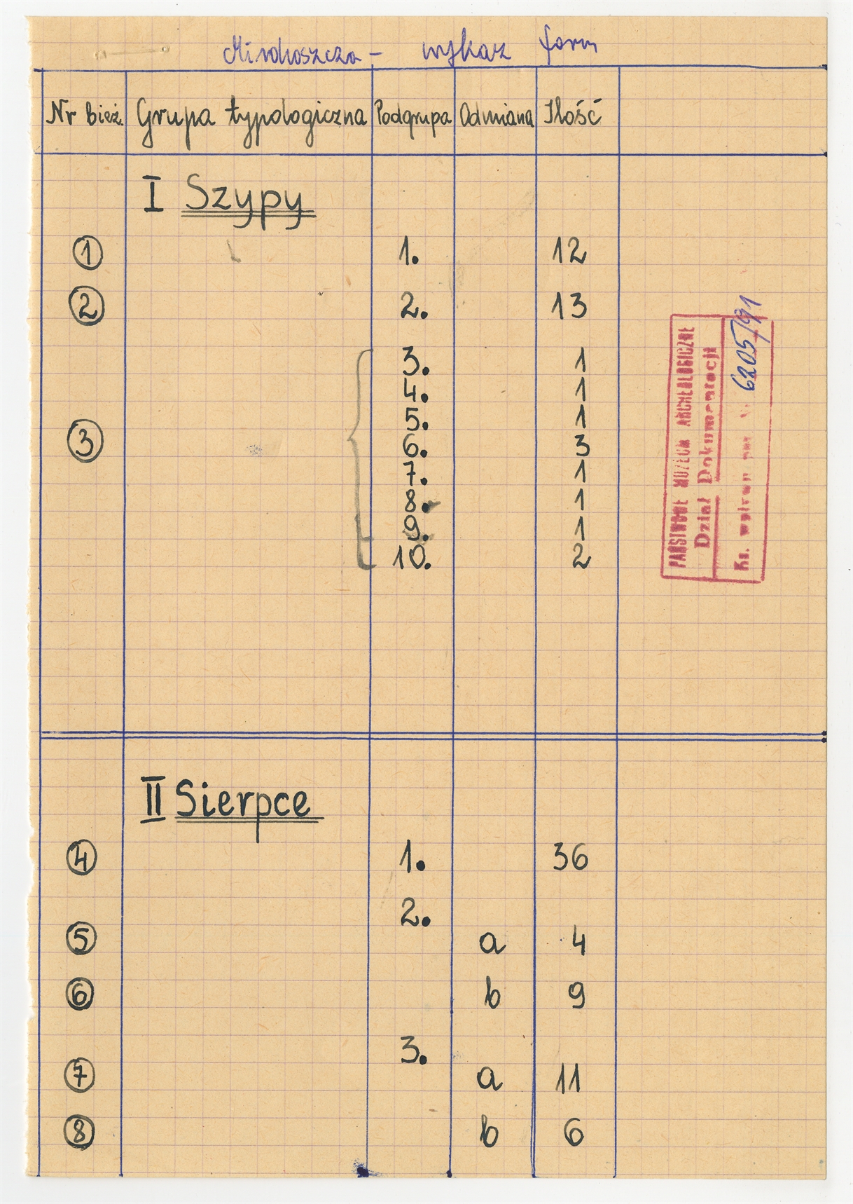 Rękopis pracy „Mirohoszcza” Wykaz form – strona 1: Szypy Sierpce