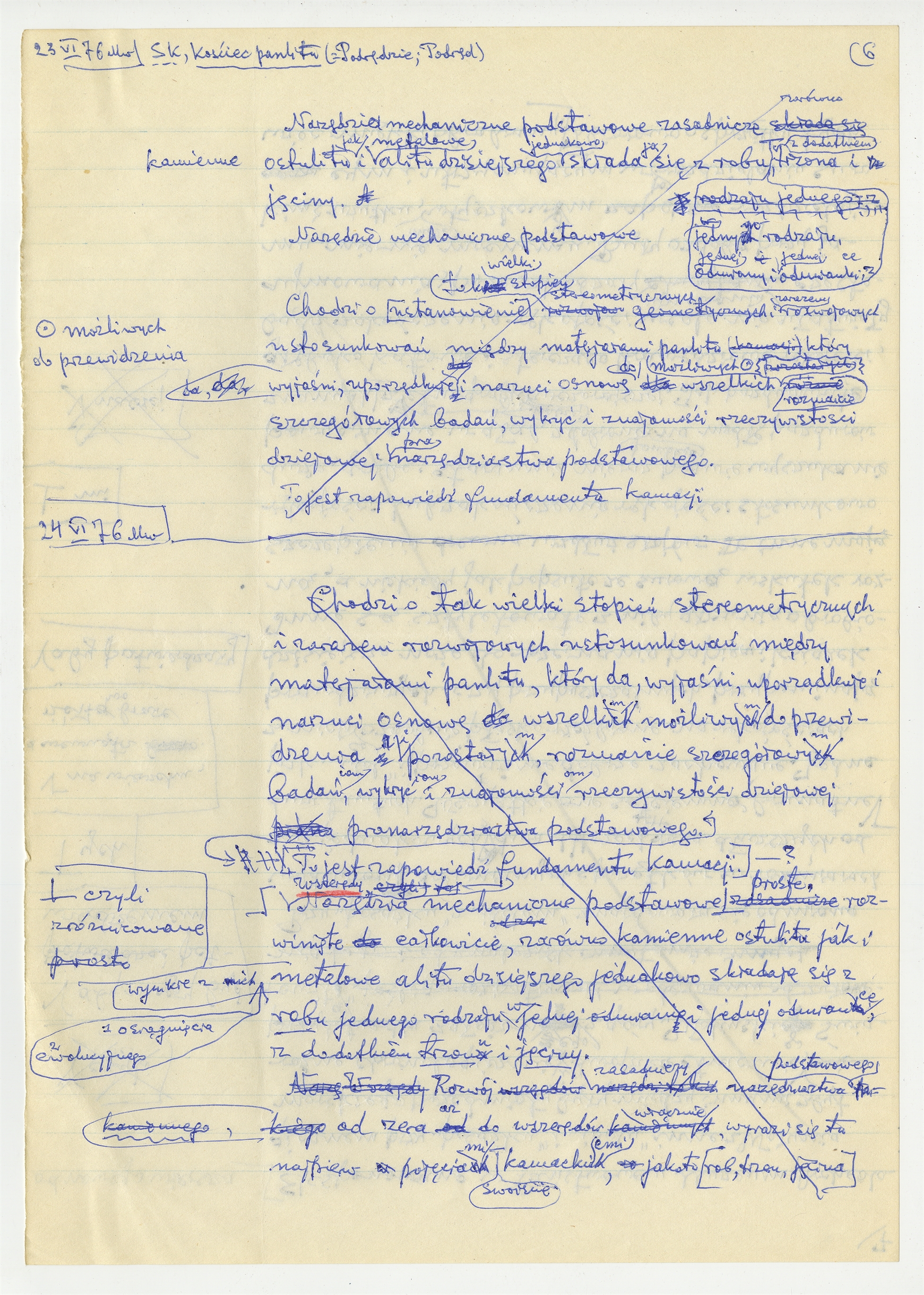 Rękopis pracy pt. "Kościec panlitu" - strona 19: "Rzecz z pranarzędziarstwa podstawowego kamiennego do robienia narzędzi z kamienia i ze surowców innych" c.d. 23-24 VI [19]76