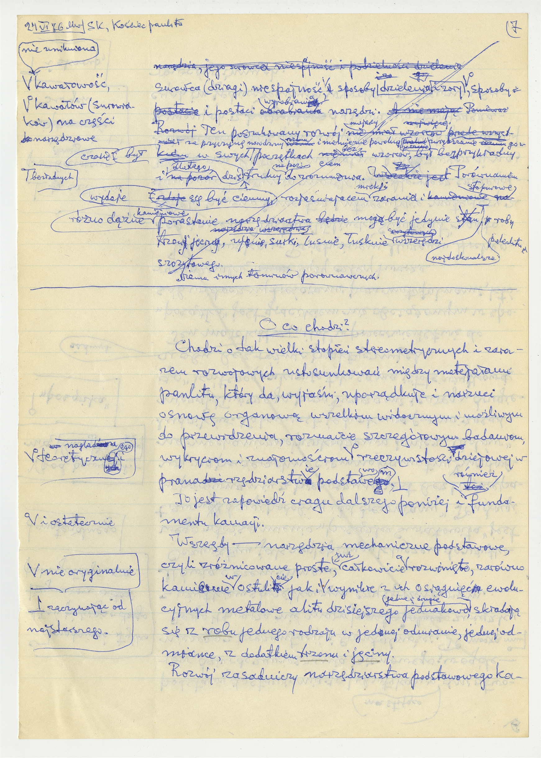 Rękopis pracy pt. "Kościec panlitu" - strona 20: "Rzecz z pranarzędziarstwa podstawowego kamiennego do robienia narzędzi z kamienia i ze surowców innych" c.d. 24 VI [19]76