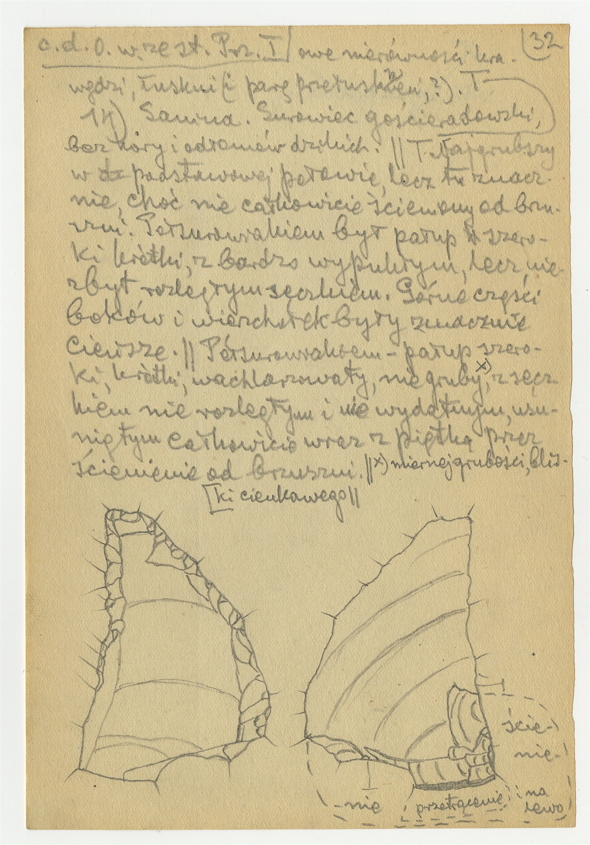 Rękopis pracy pt. "Materjał 1-y do Pasprzęt przemyski" - strona 38: "13. Sanina (przemyślina). Sur. swiec. (…)" c.d. "14. Sanina. Surowiec gościeradowski (…)