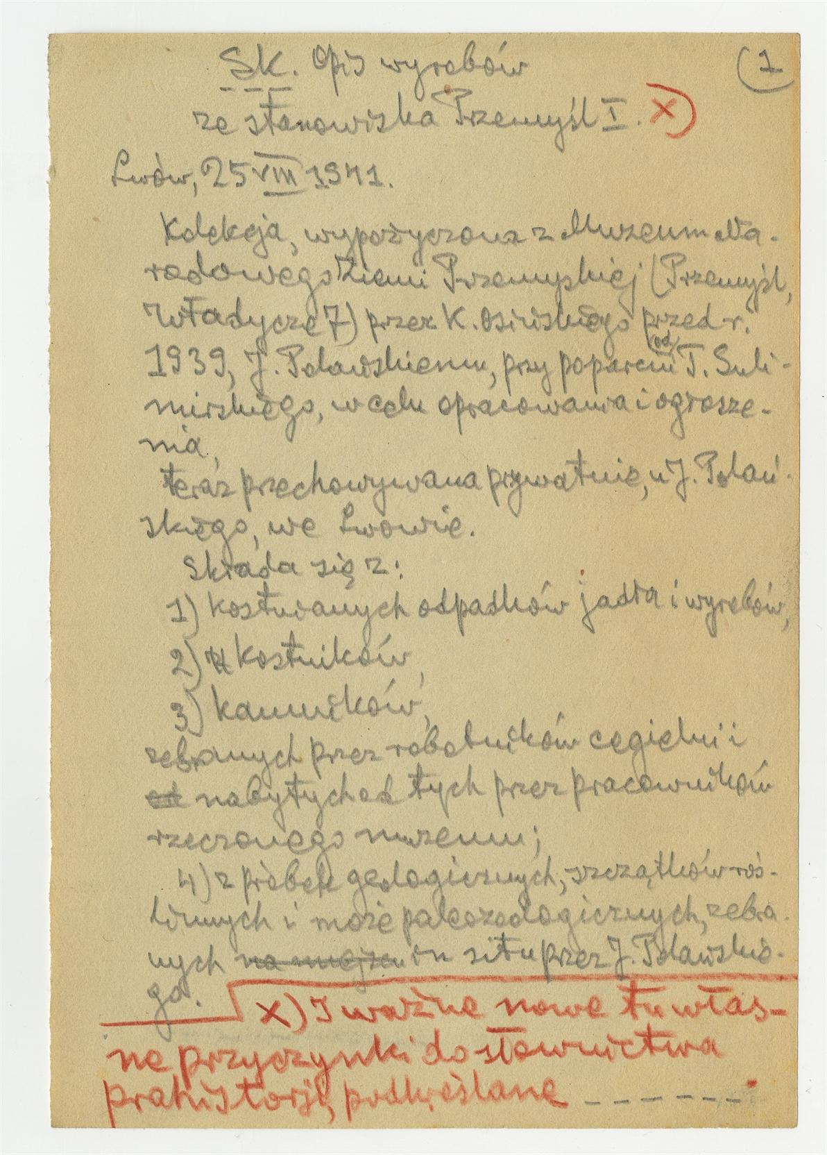 Rękopis pracy pt. "Materjał 1-y do Pasprzęt przemyski" - strona 7: "Opis wyrobów ze stanowiska Przemyśl I Lwów 25 VIII 1941"