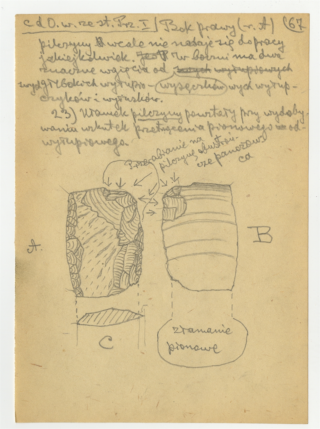 Rękopis pracy pt. "Materjał 1-y do Pasprzęt przemyski" - strona 73: "Opis okazu 22" c.d. "23. Ułamek pilczyny (…)"