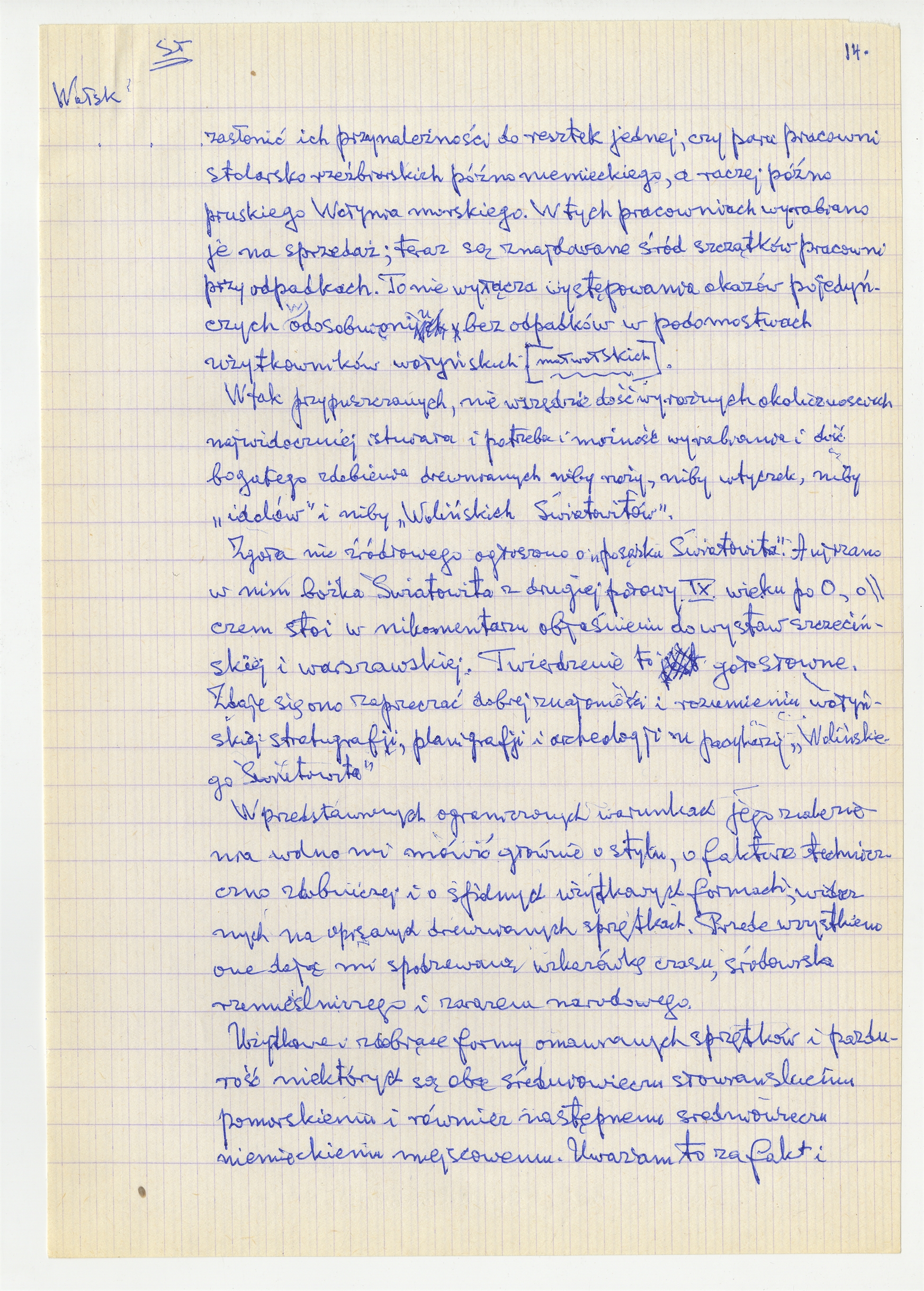 Rękopis pracy pt. "Prusacki Światowitak [do Kam 74]" (wersja 5) - strona 14: "(…)zasłonic ich przynależności do resztek jednej czy paru pracowni (…)"