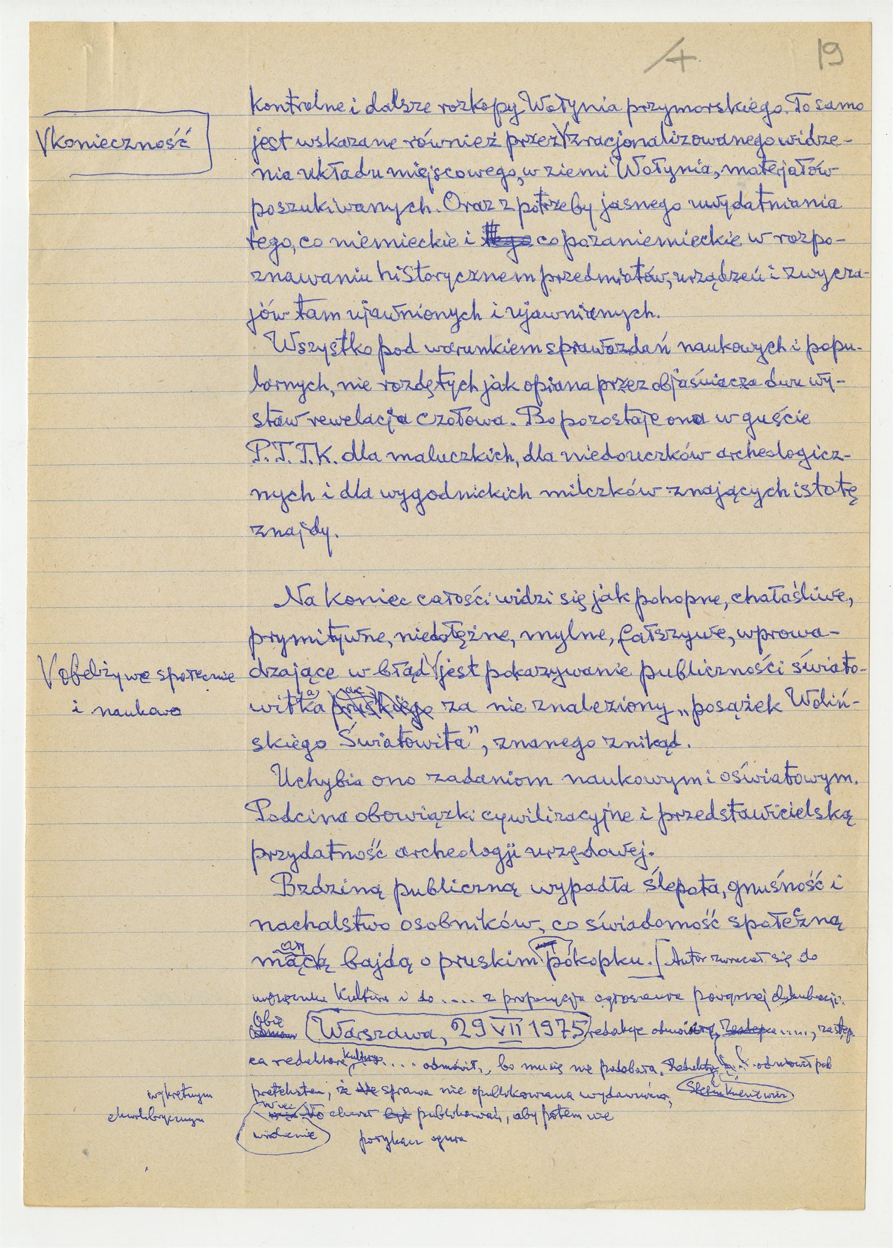 Rękopis pracy pt. "Prusacki Światowitek" (wersja 3) - strona 20: "(…) To samo jest wskazane również przez konieczność zracjonalizowanego widzenia (…)" Warszawa 29 VII 1975