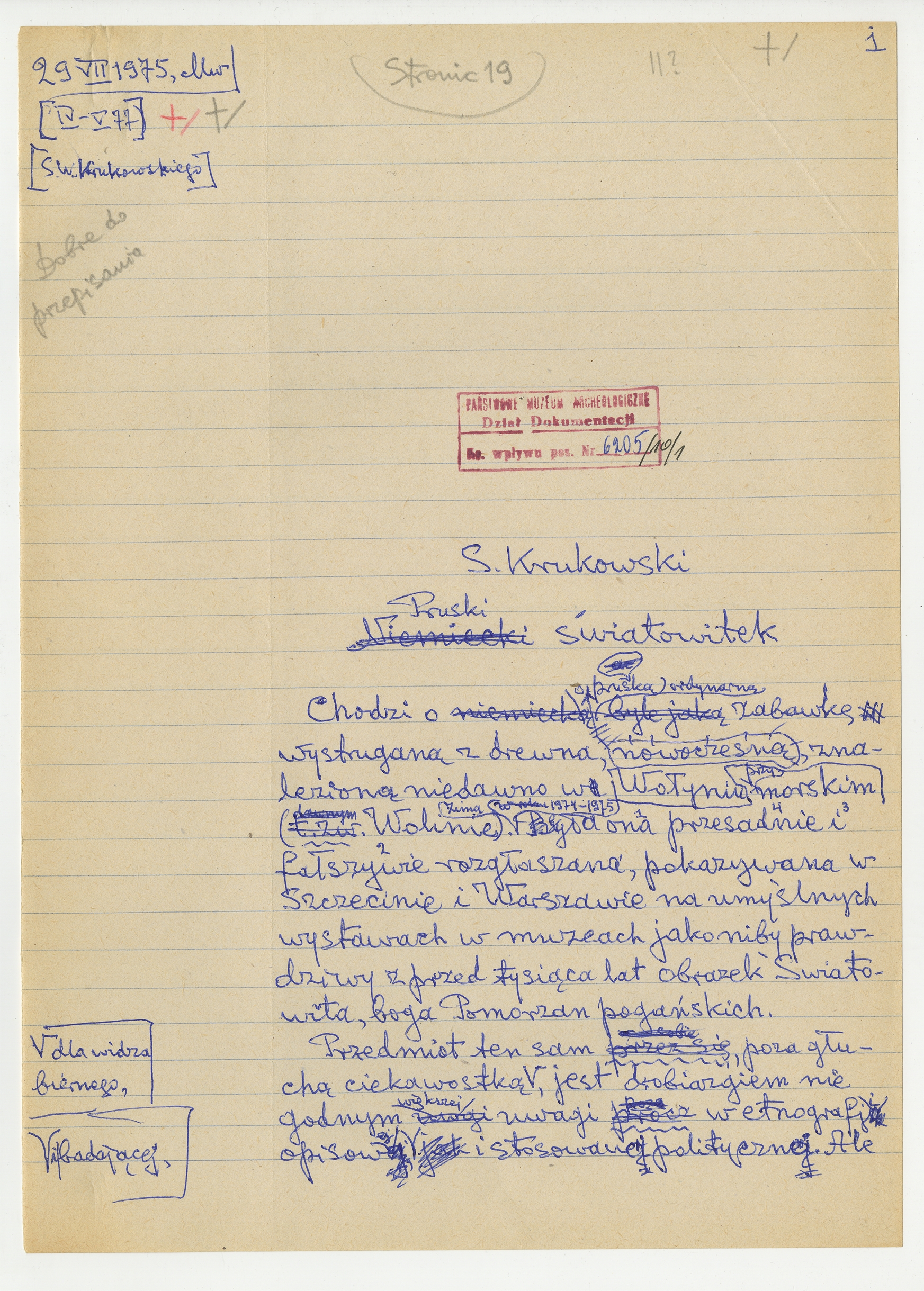 Rękopis pracy pt. "Pruski Światowitek" (wersja 2) - strona 1: tytuł "Chodzi o pruską ordynarną zabawkę (…)"