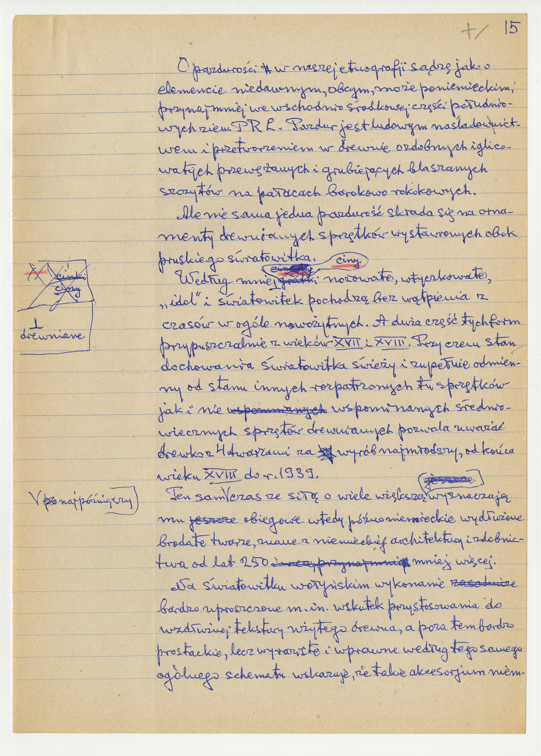 Rękopis pracy pt. "Pruski Światowitek" (wersja 2) - strona 15: "(…) O pazdurości w naszej etnografji sądzę jako o elemencie niedawnym (…)"