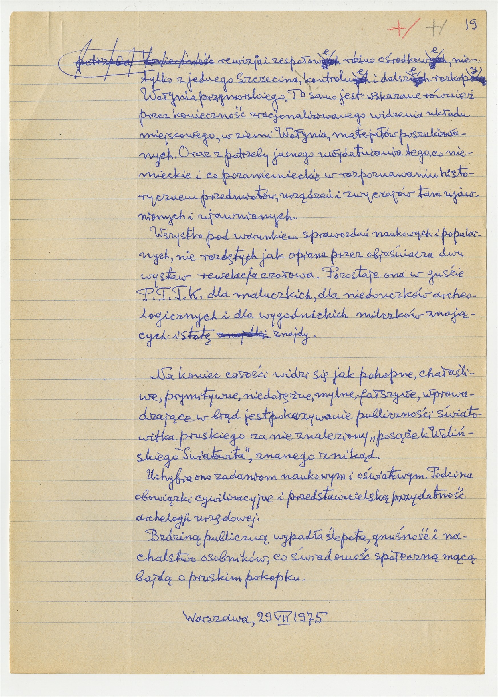 Rękopis pracy pt. "Pruski Światowitek" (wersja 2) - strona 19: "(…) To samo jest wskazane również przez konieczność zracjonalizowanego widzenia układu miejscowego (…)" Warszawa 29 VII 1975