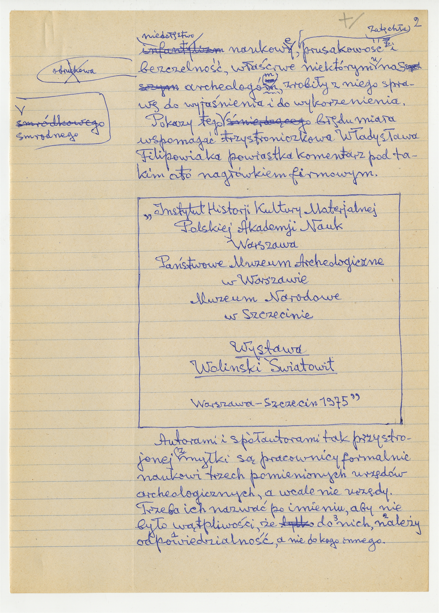 Rękopis pracy pt. "Pruski Światowitek" (wersja 2) - strona 2: "(…) niedołęstwo naukowe zatęchła prusakowośc i bezczelność (…)"