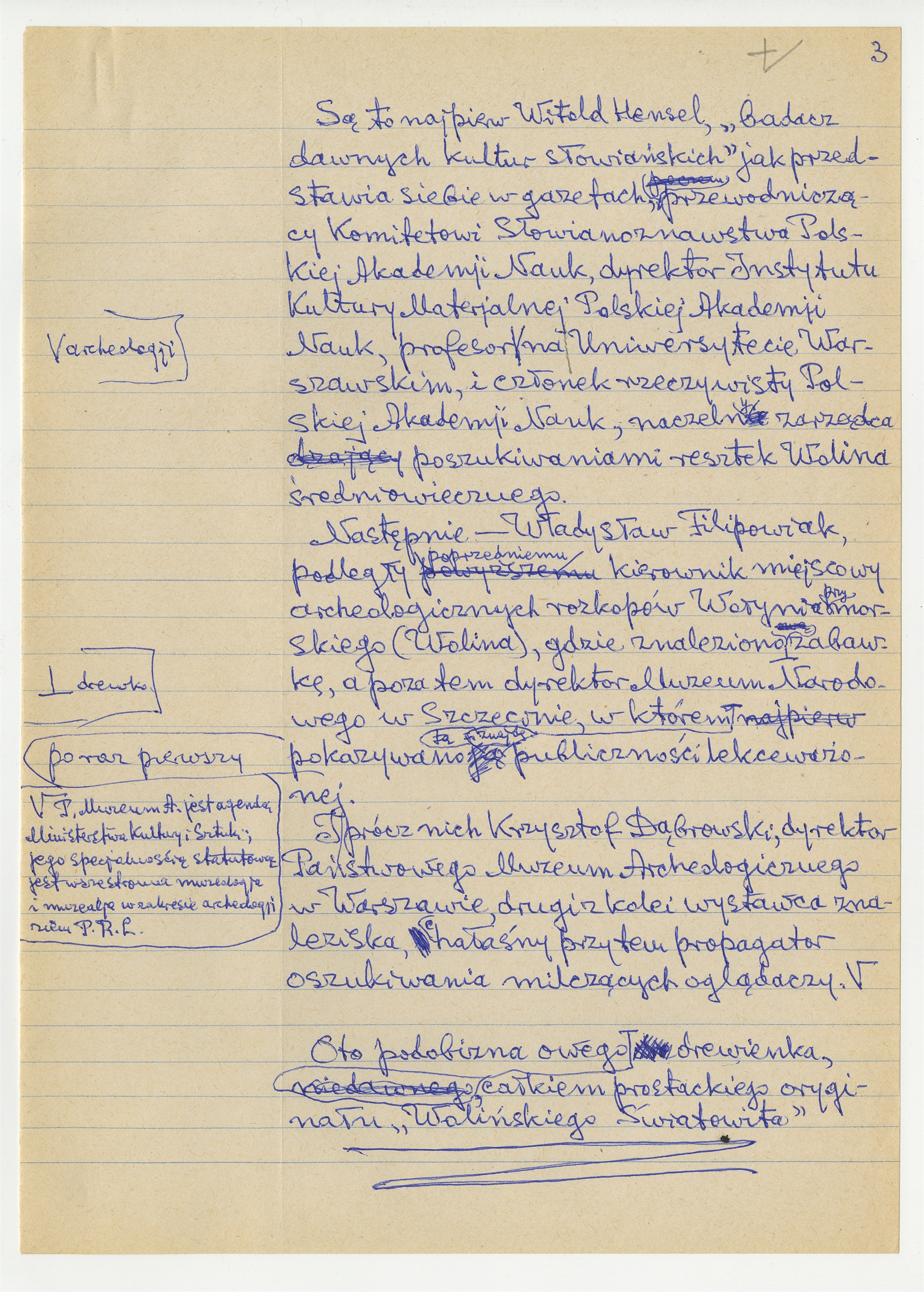 Rękopis pracy pt. "Pruski Światowitek" (wersja 2) - strona 3: "(…) Są to najpierw Witold Hensel 'badacz dawnych kultur słowiańskich' (…)"