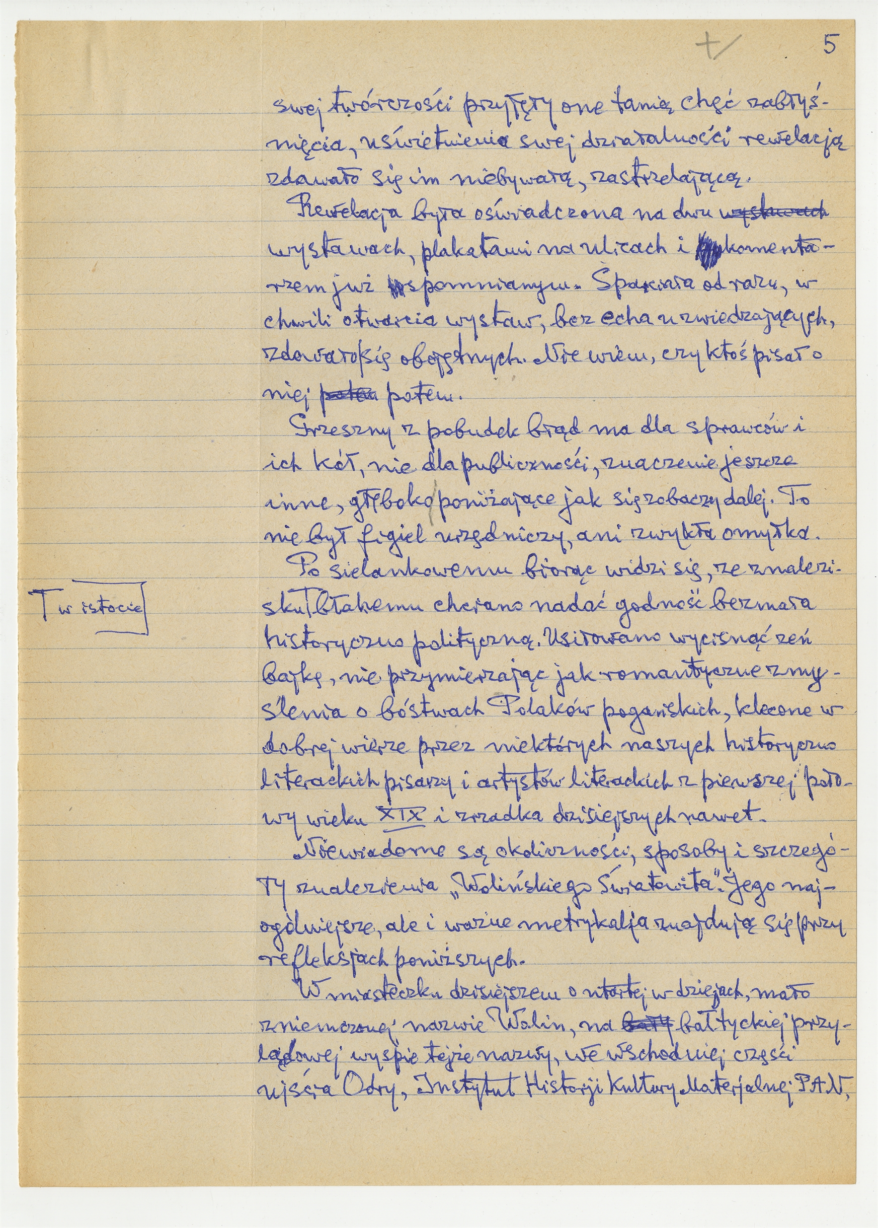 Rękopis pracy pt. "Pruski Światowitek" (wersja 2) - strona 5: "(…) swej twórczości przyjęły one chęć zabłyśnięcia (…)"