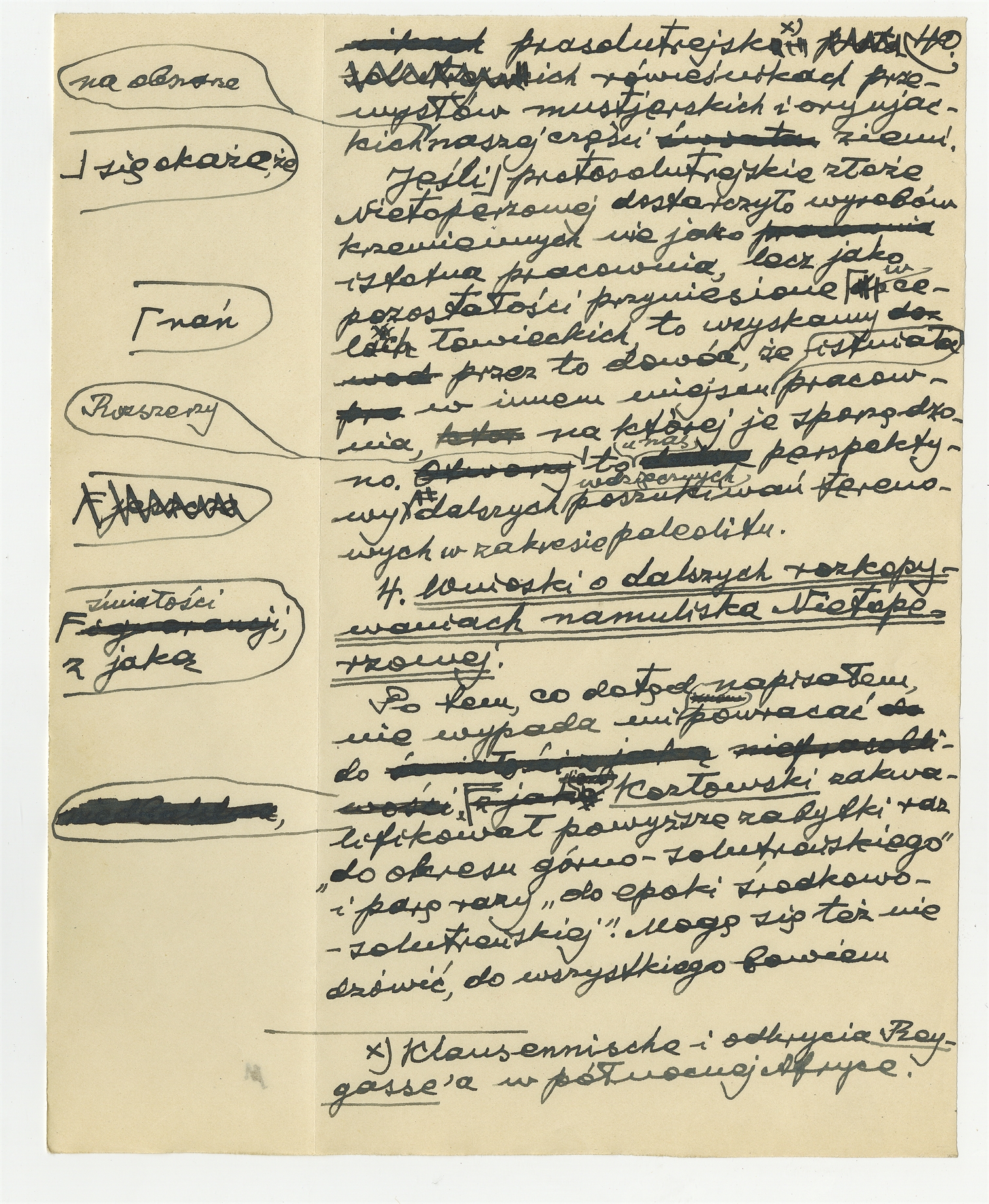 Rękopis pracy pt. "Przemysł protosolutrejski w jaskini Nietoperzowej" - strona 42: "3. Przynależność kulturowa" c.d. "4. Wnioski o dalszych rozkopywaniach namuliska Nietoperzowej"