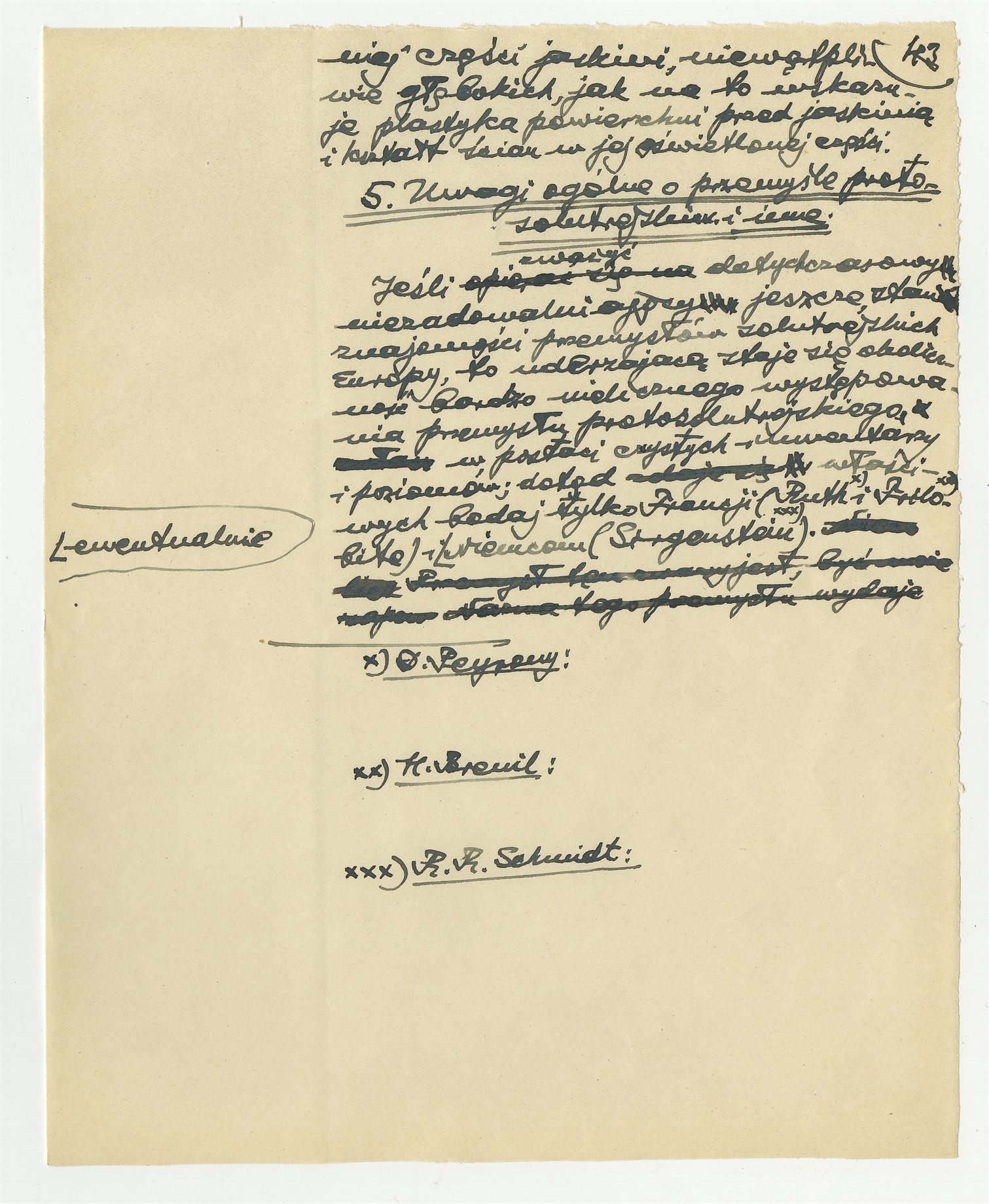 Rękopis pracy pt. "Przemysł protosolutrejski w jaskini Nietoperzowej" - strona 46: "4. Wnioski o dalszych rozkopywaniach namuliska Nietoperzowej" c.d. "5. Uwagi ogólne o przemyśle protosolutrejskim i inne"