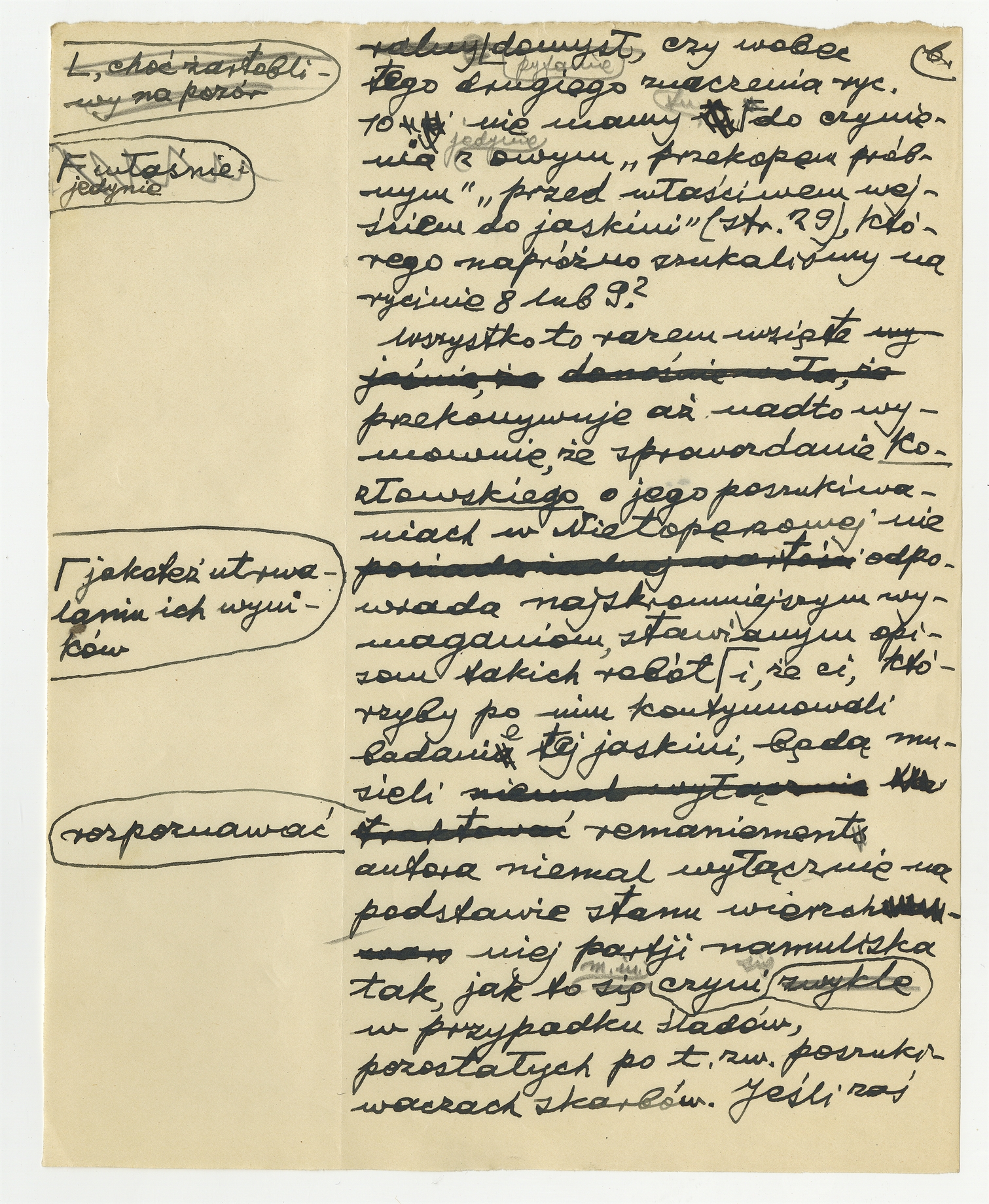 Rękopis pracy pt. "Przemysł protosolutrejski w jaskini Nietoperzowej" - strona 6: "1. Opis jaskini Nietoperzowej i robót Kozłowskiego w niej" c.d.