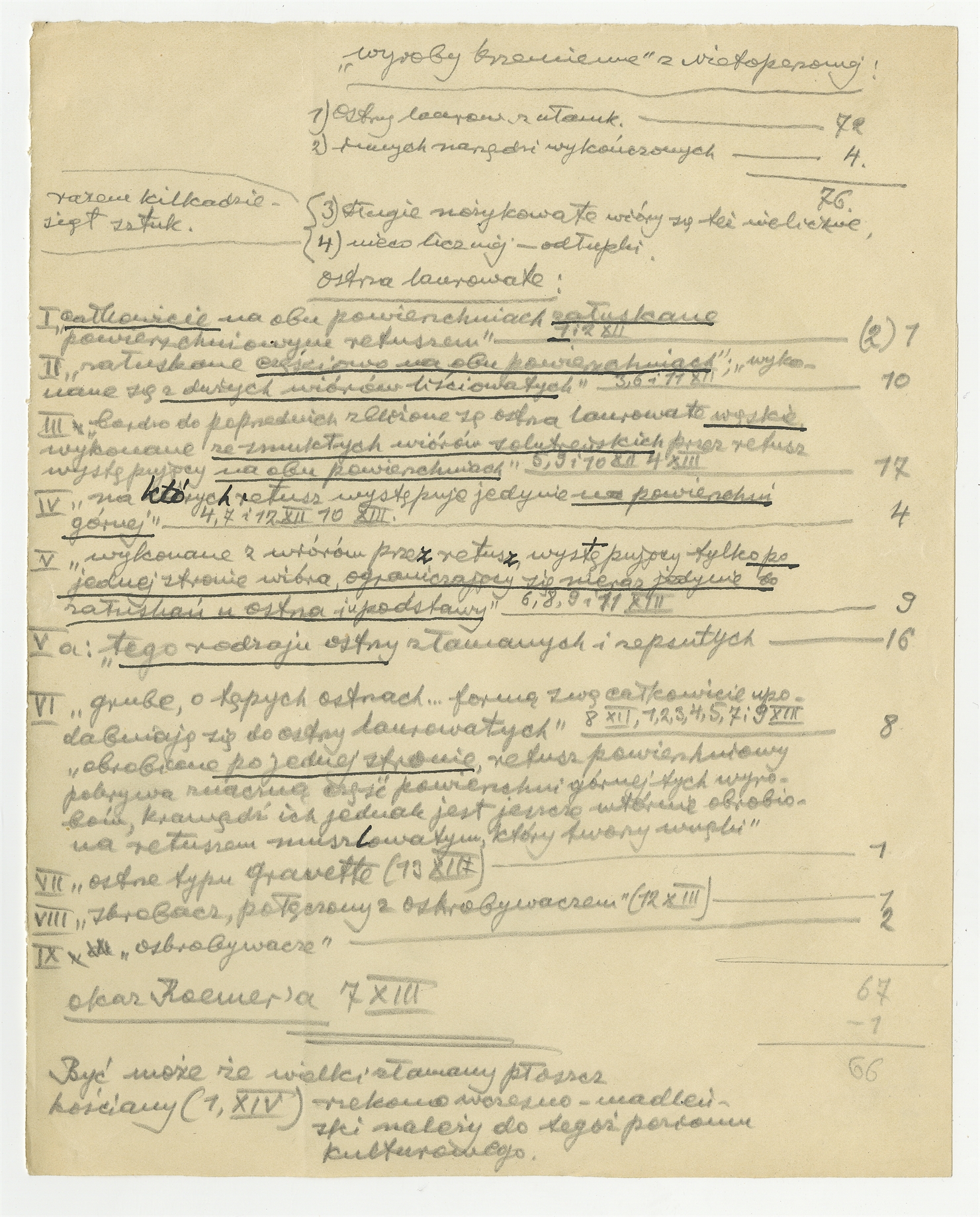 Rękopis pracy pt. "Przemysł protosolutrejski w jaskini Nietoperzowej" - strona 67: "Podział mój inwentarza […] z Nietop." c.d.