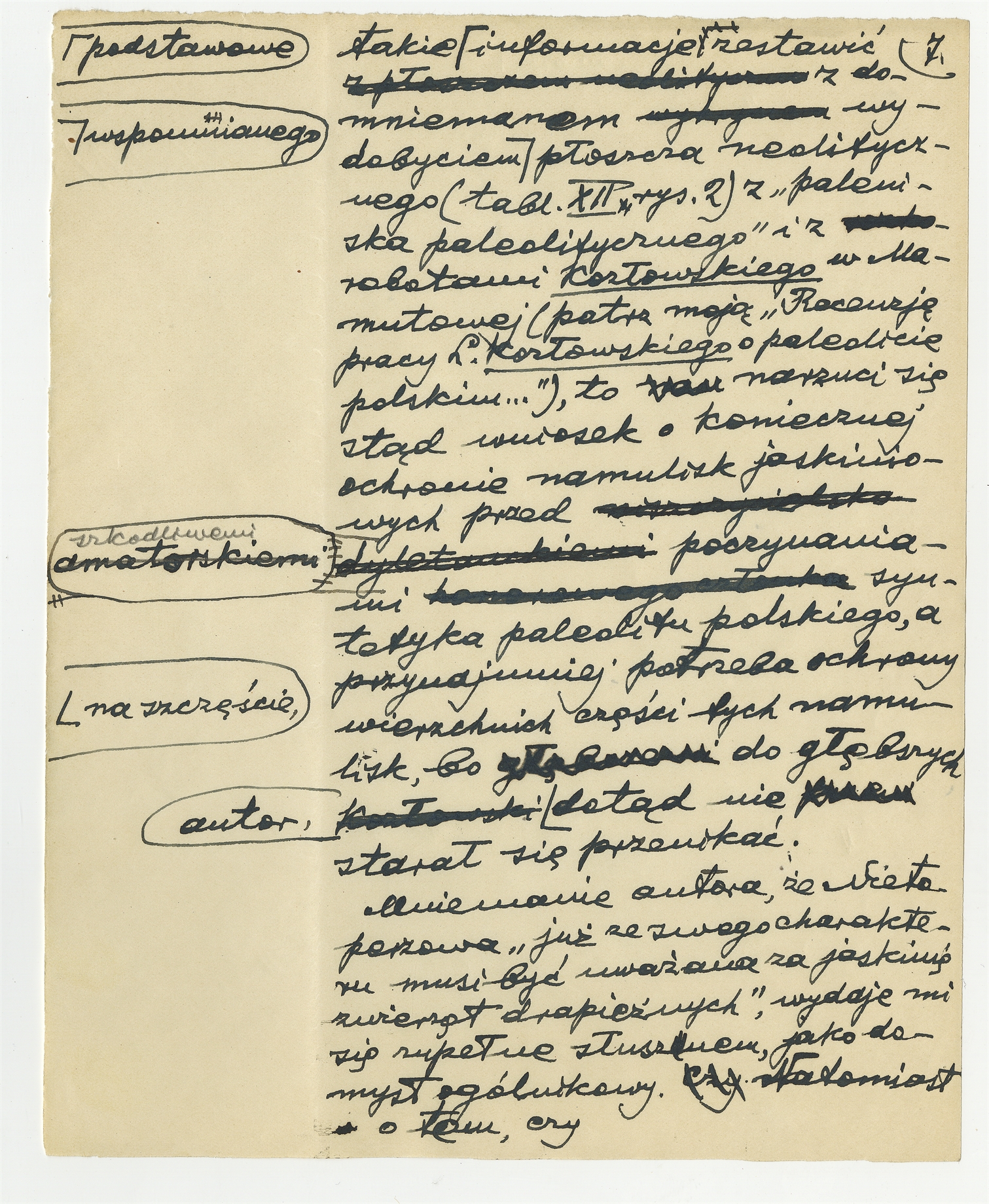 Rękopis pracy pt. "Przemysł protosolutrejski w jaskini Nietoperzowej" - strona 7: "1. Opis jaskini Nietoperzowej i robót Kozłowskiego w niej" c.d.
