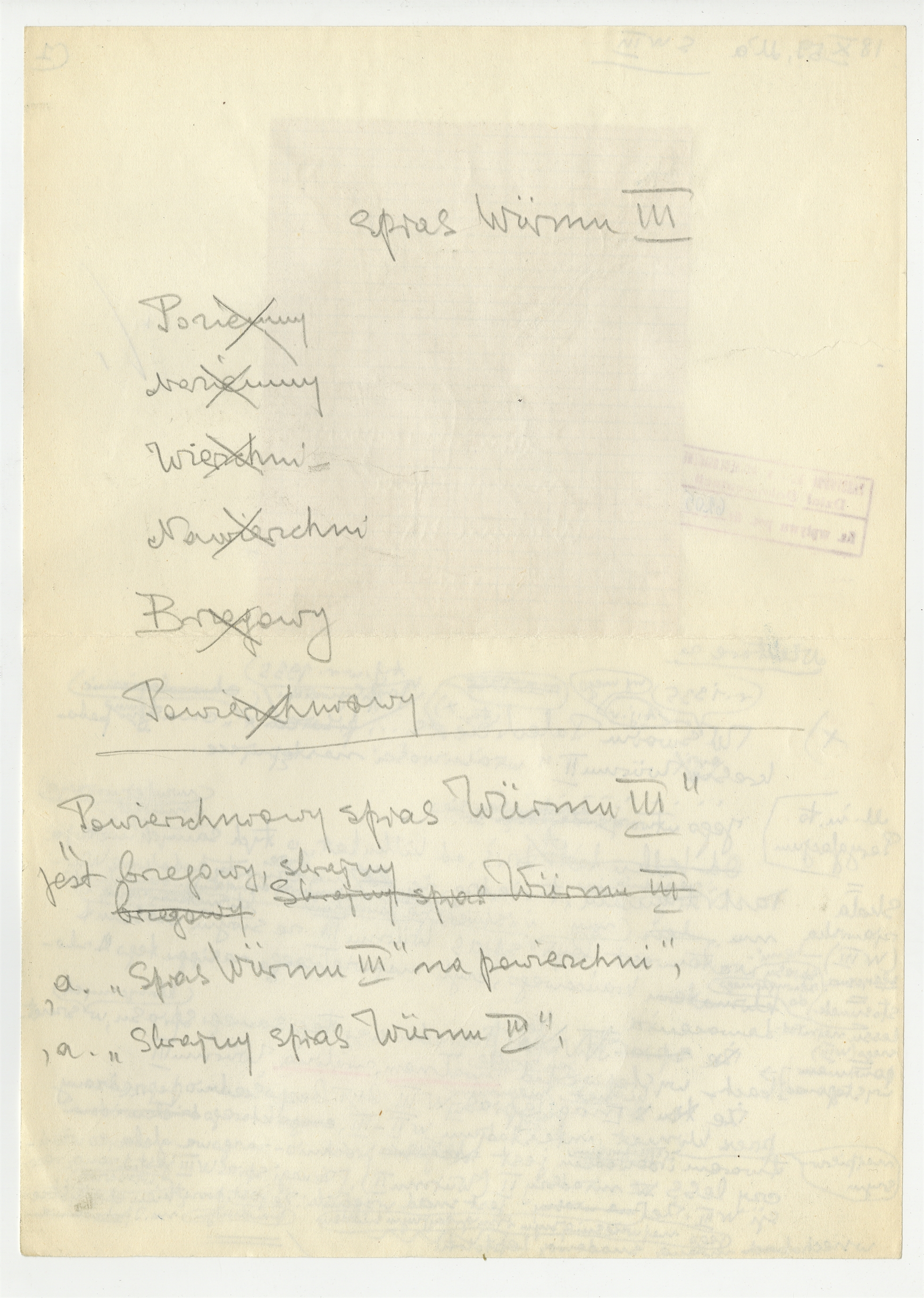 Rękopis pracy pt. "Spias [brzegowy] nawierzchni Würmu III" - strona 2: tytuł pracy w kilku wersjach