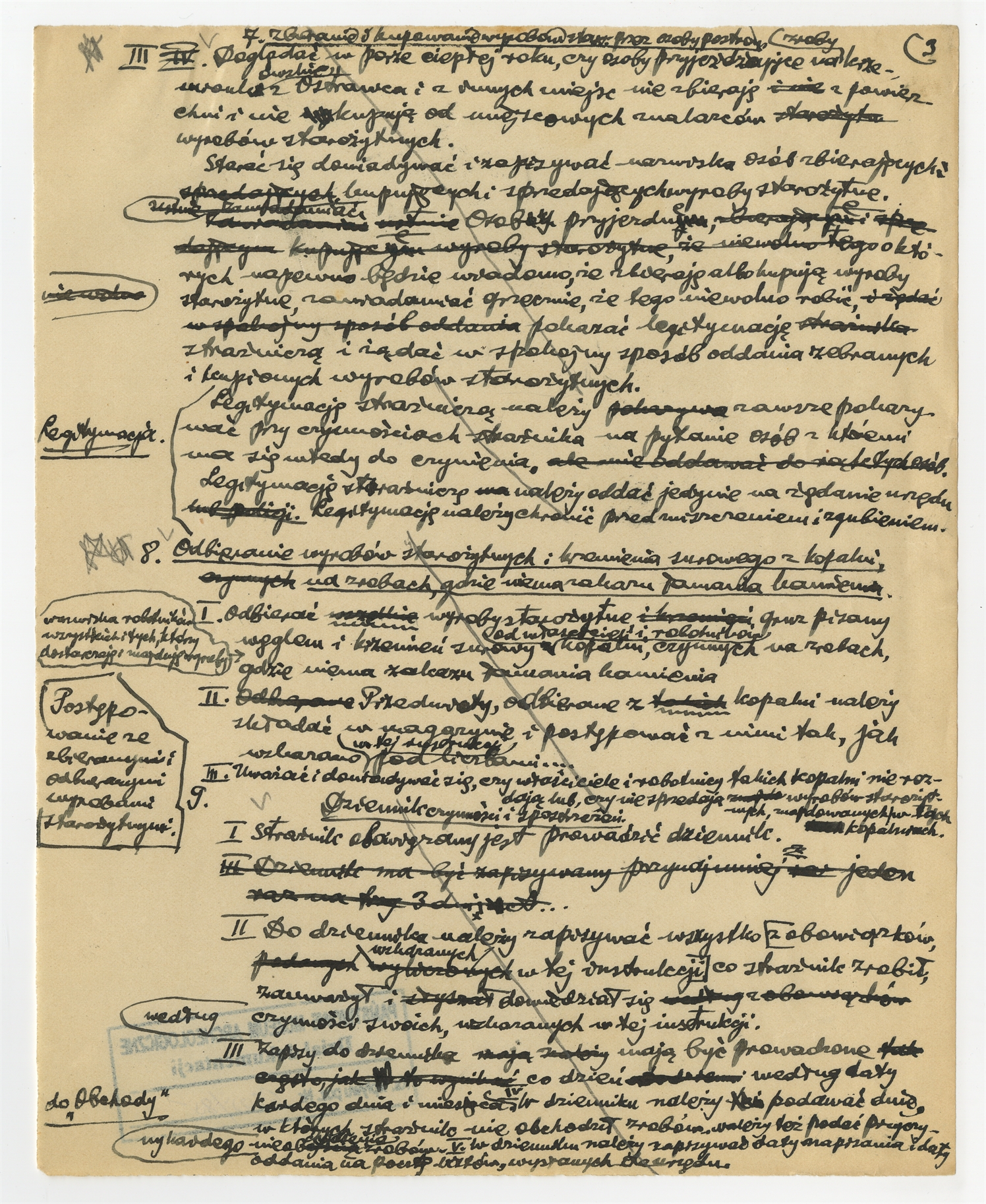 Rękopis - Projekt instrukcji regulaminowej dla strażnika Krzemionek 9 I 1929 - "7. Zbieranie i kupowanie wyrobów..." autorska numeracja stron - 3