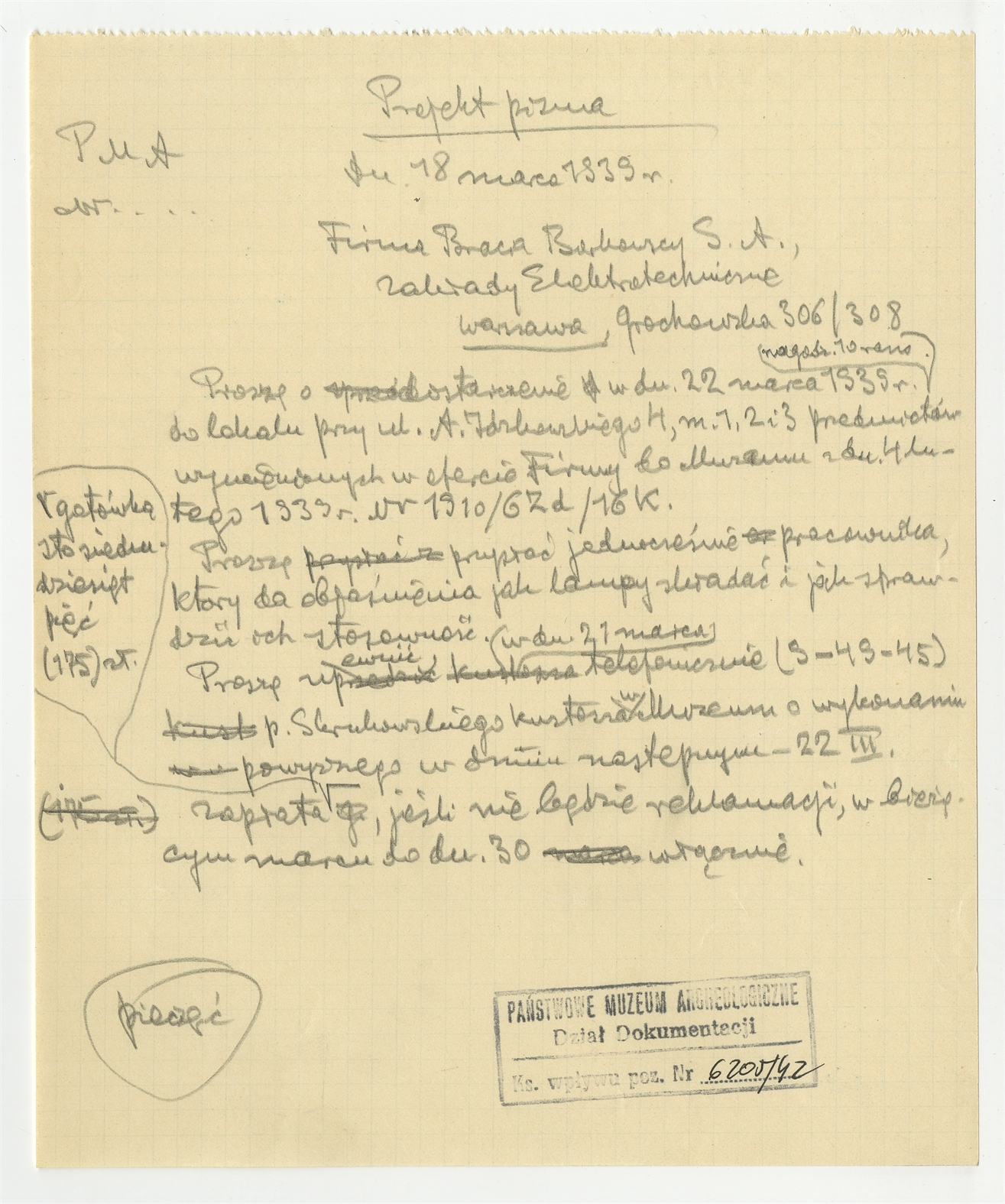 Rękopis - projekt pisma Stefana Krukowskiego z dnia 18 marca 1939 roku do Firmy Bracia Borkowscy S.A.