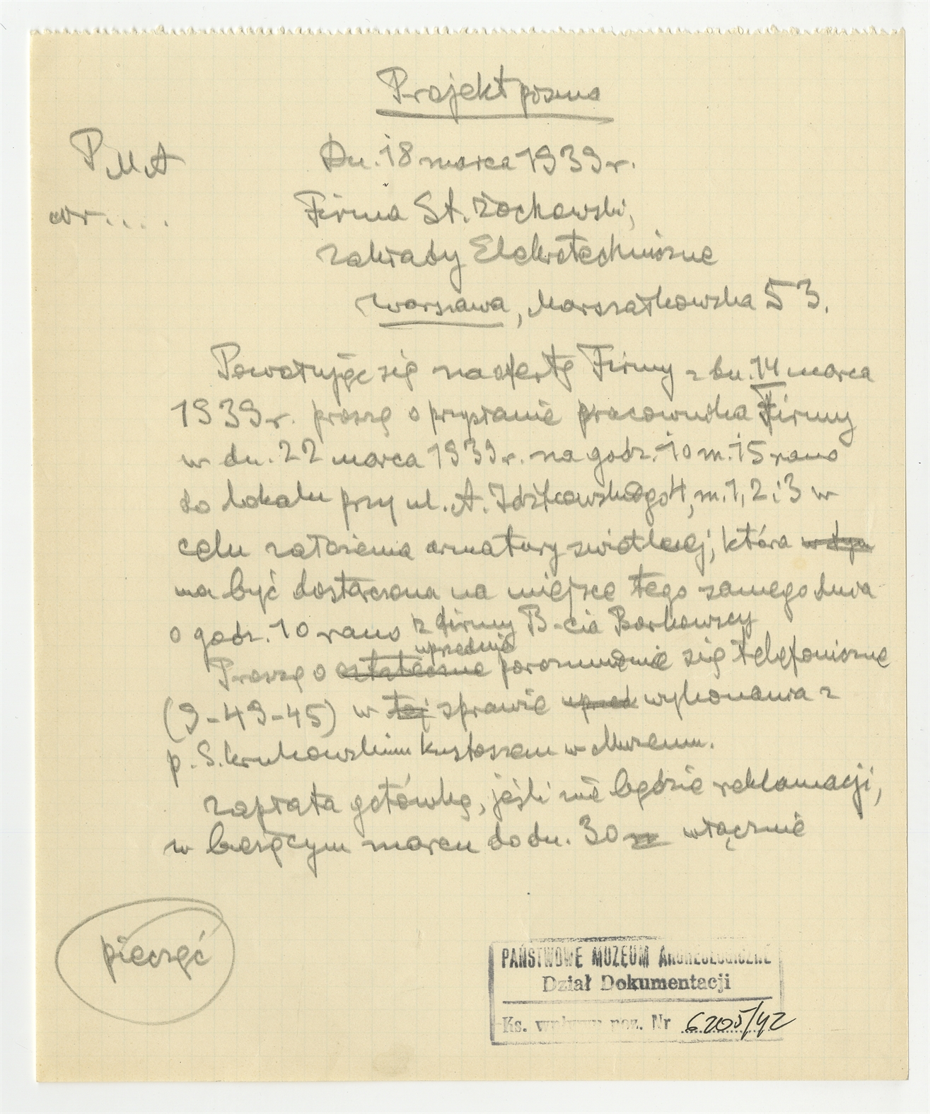 Rękopis - projekt pisma Stefana Krukowskiego z dnia 18 marca 1939 roku do Firmy St. Żochowski Zakłady Elektrotechniczne