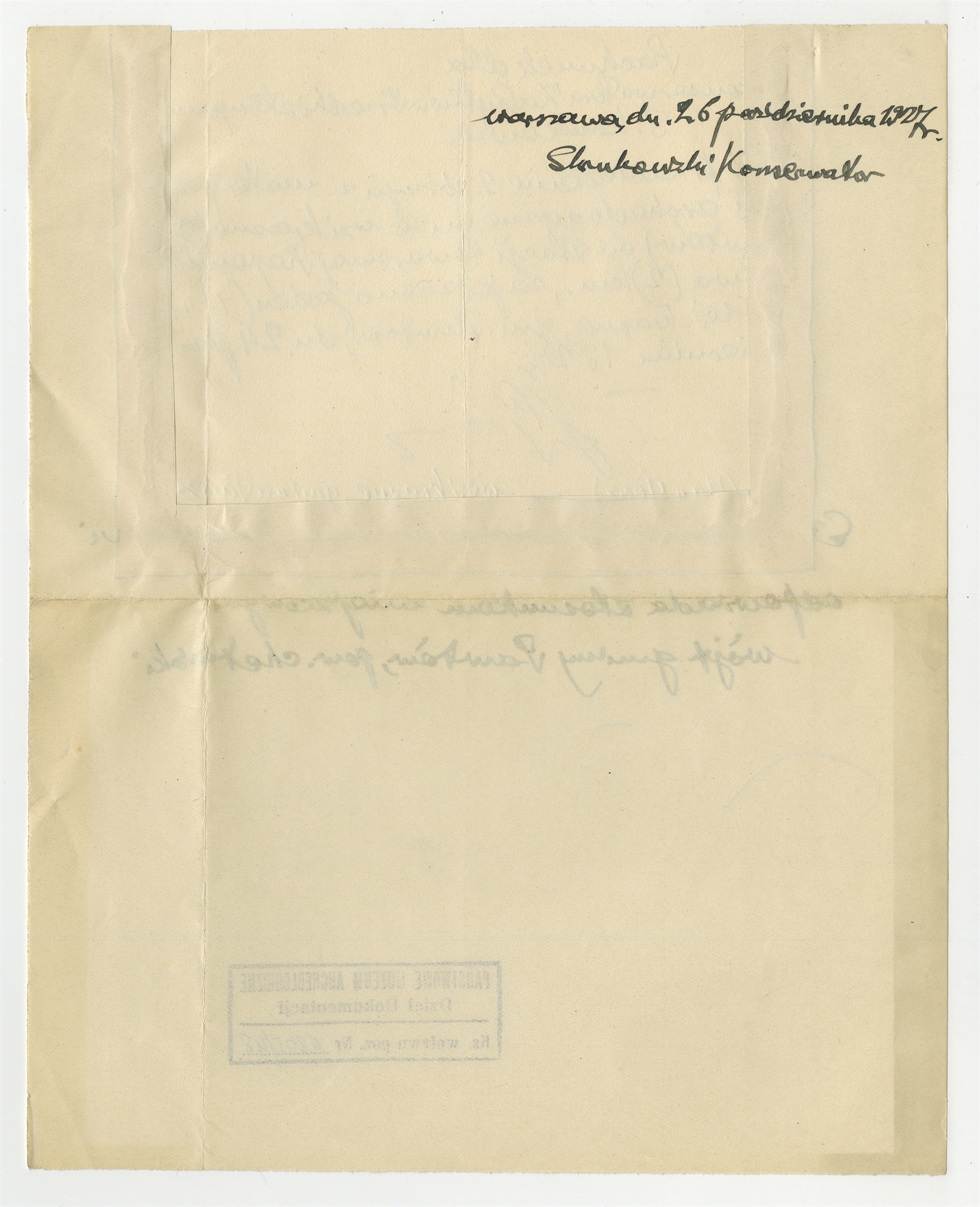 Rękopis - rachunek sporządzony przez Jana Górę dla Konserwatora Zabytków Przedhistorycznych S. Krukowskiego wraz z potwierdzającym cenę wpisem wójta gminy Pawłów w pow. Chełmskim - strona 1: data - 26 października 1927 r. i podpis S. Krukowskiego