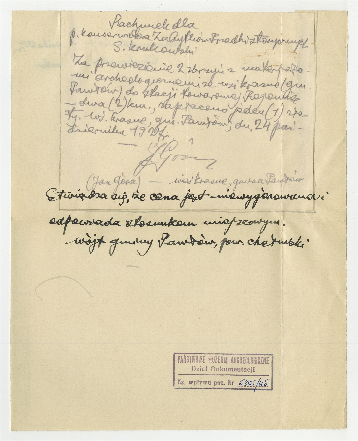 Rękopis - rachunek sporządzony przez Jana Górę dla Konserwatora Zabytków Przedhistorycznych S. Krukowskiego wraz z potwierdzającym cenę wpisem wójta gminy Pawłów w pow. Chełmskim - strona 1: "Za przewiezienie 2 skrzyń" … "odpowiada stosunkom niniejszym" 24 października 1927