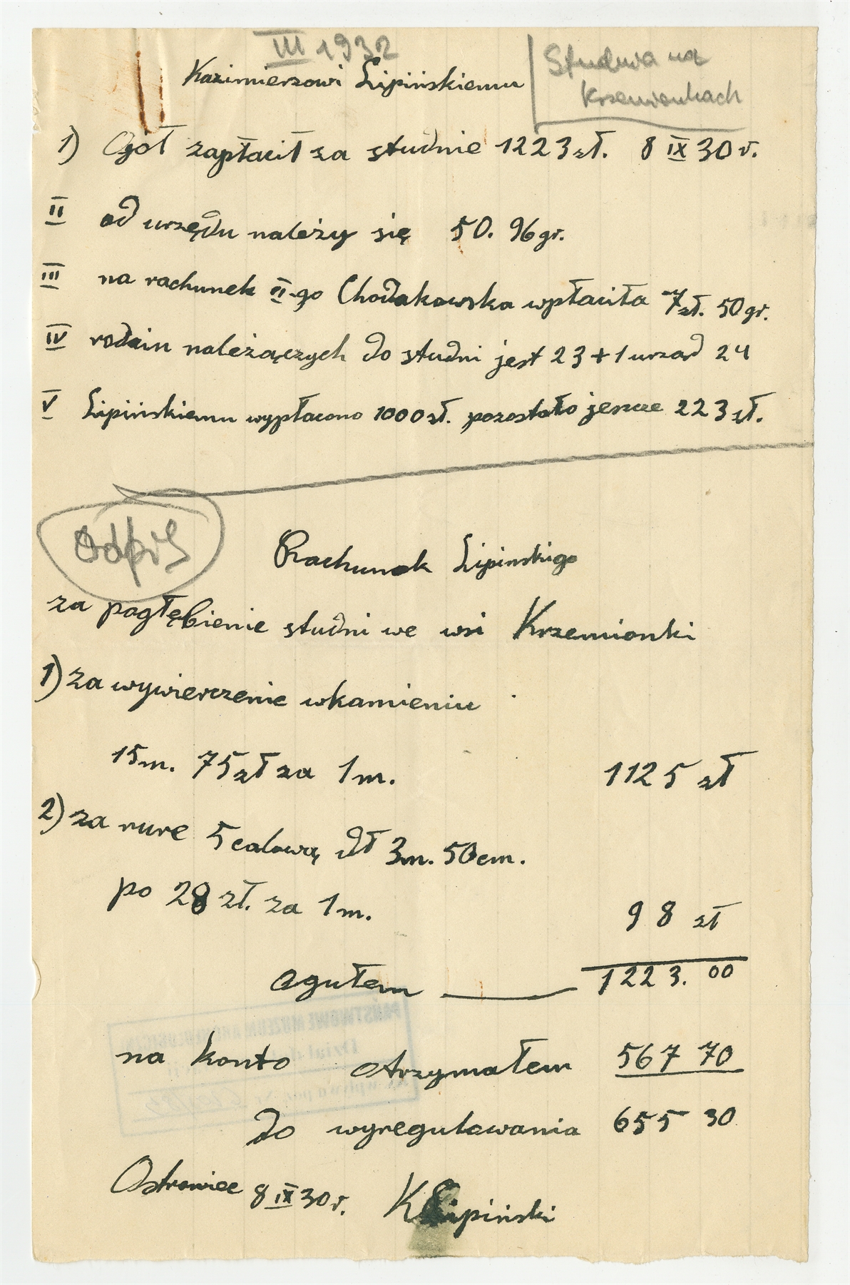 Rękopis - rachunek z dnia 8 IX [19]30 roku od K. Lipińskiego za pogłębienie studni we wsi Krzemionki