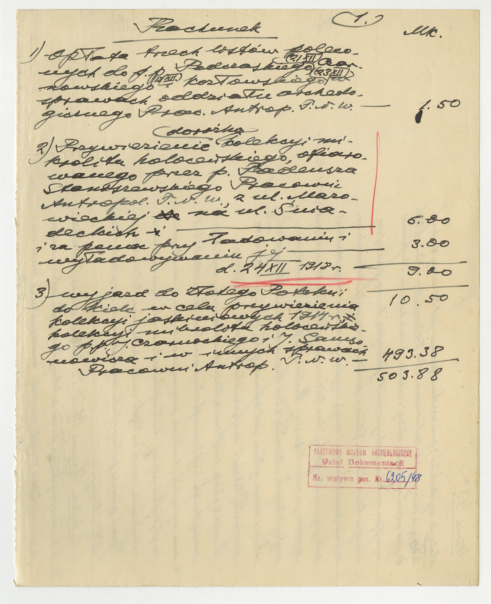 Rękopis - rachunek za wysłanie trzech listów poleconych przewiezienie dorożką kolekcji mikrolitu holoceńskiego oraz wyjazd do Złotego Stoku - strona 1: "Opłata trzech listów" … "Pracowni Antrop. T.N.W." 24 XII 1918 (autorska strona 1)